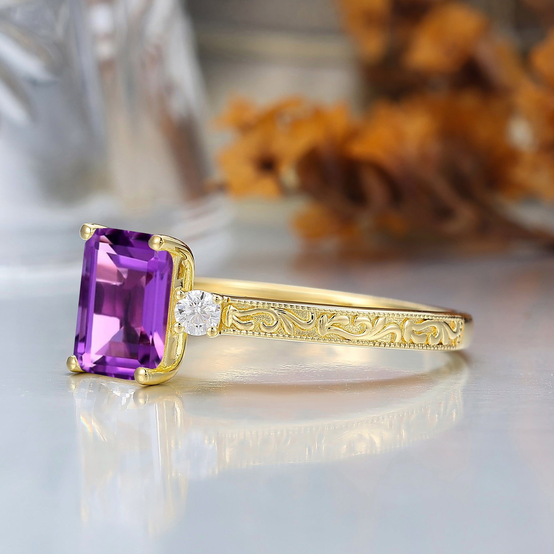 Unique Milgraine 2CT Emerald Cut Amethyst Wedding Ring For Women 3 Stone Engagement Ring