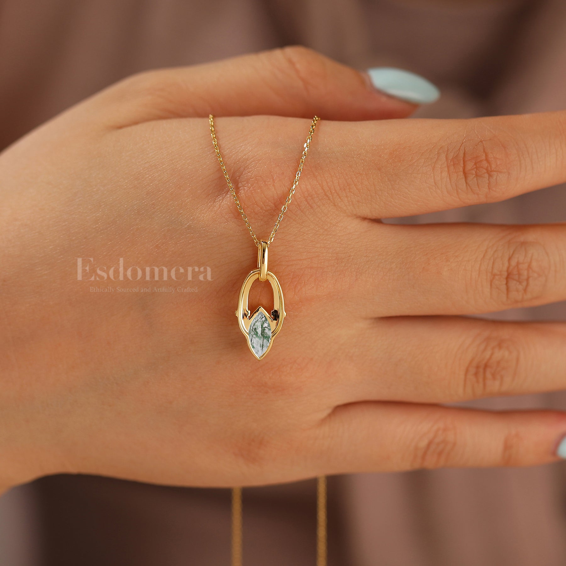 Marquise Coupe Collier en Agate Mousse Pendentif en Argent Sterling Filigrané Pendentif en Or Massif