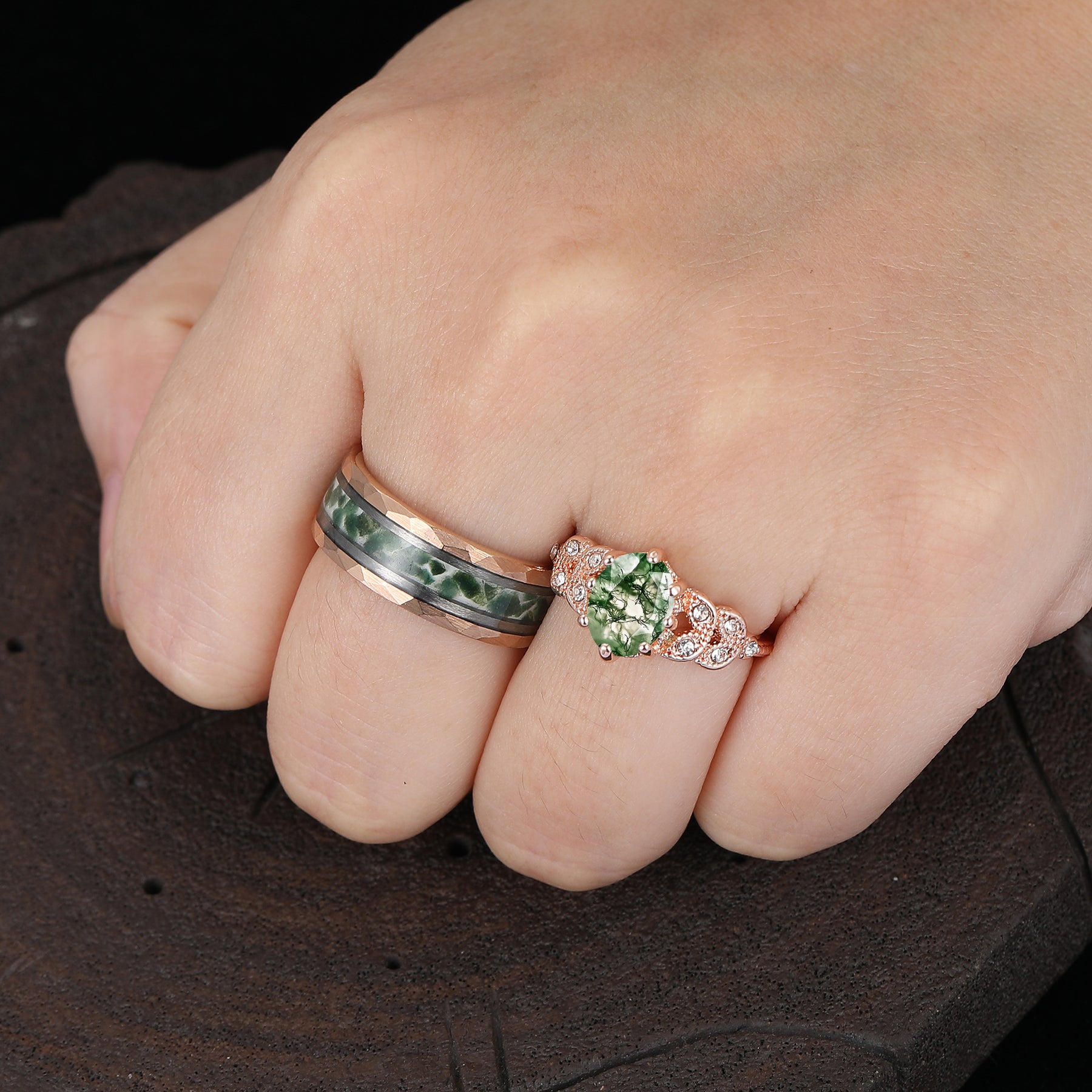 Ensemble de bagues en agate mousse d'inspiration naturelle avec finition milgrain pour lui et elle, bagues de couple Art déco