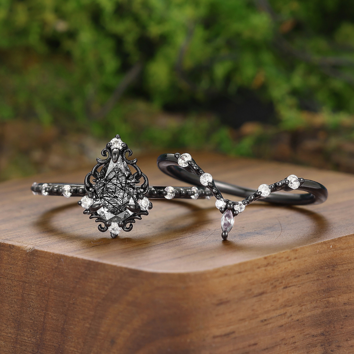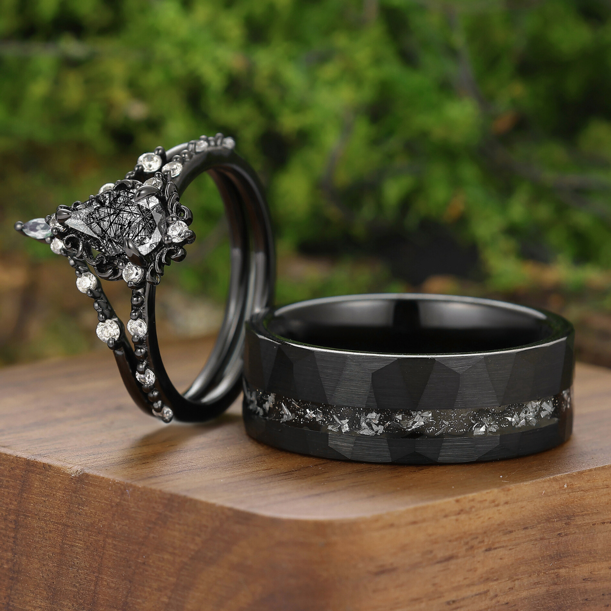 Ensemble de bagues pour couple en quartz rutile noir délicat avec filigrane milgrain Bagues uniques pour couple noir
