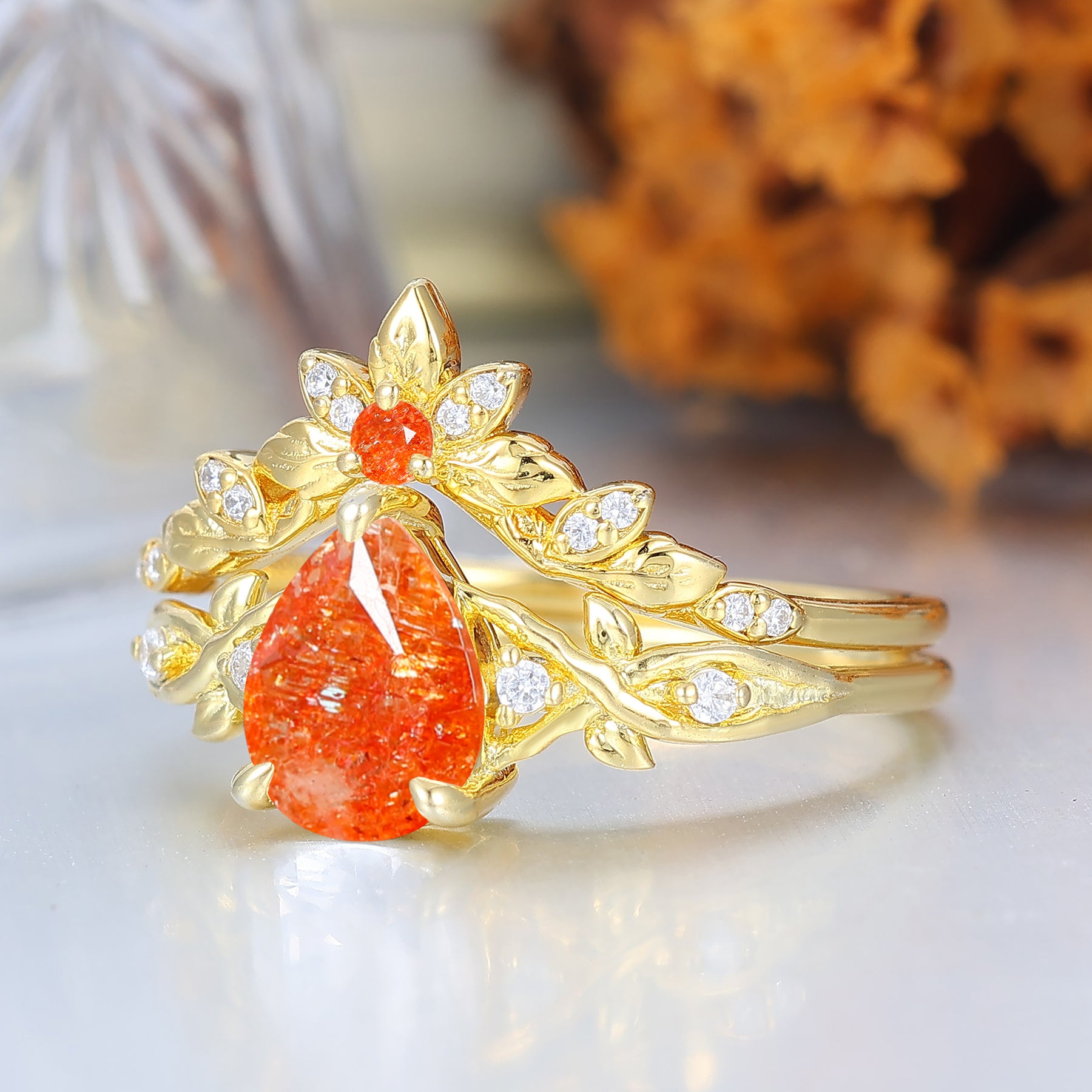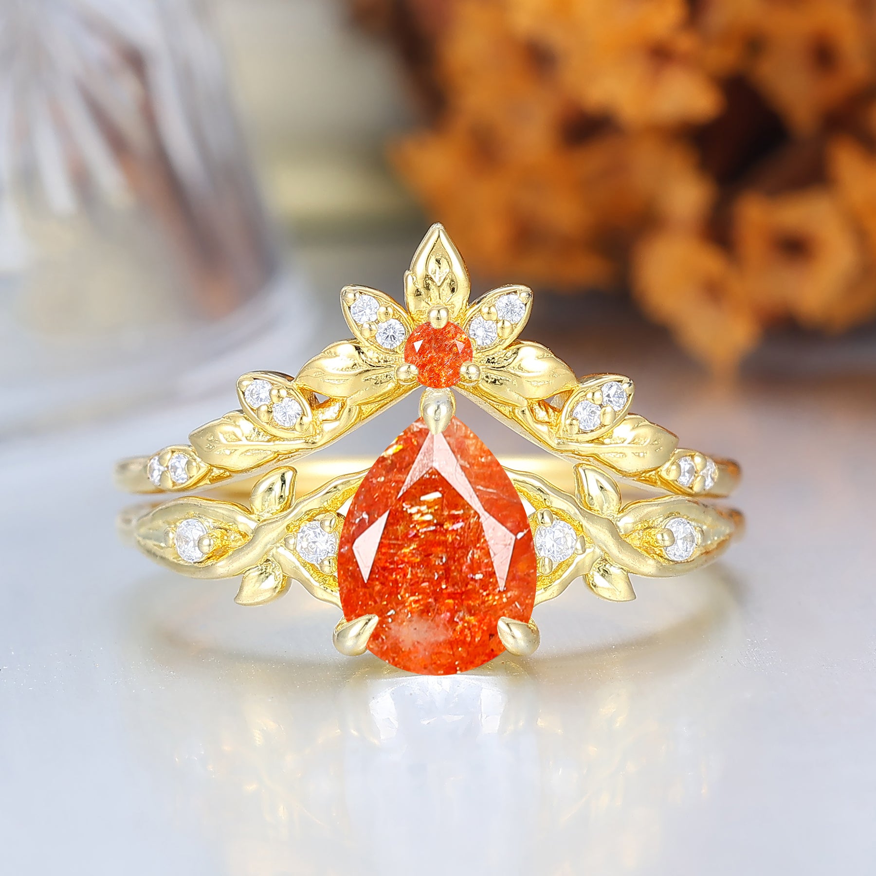 Set Nuziale con Pietra di Sole a Forma di Pera Ispirato alla Natura Anello di Fidanzamento Set Nuziale Romantico Anello Enhancer