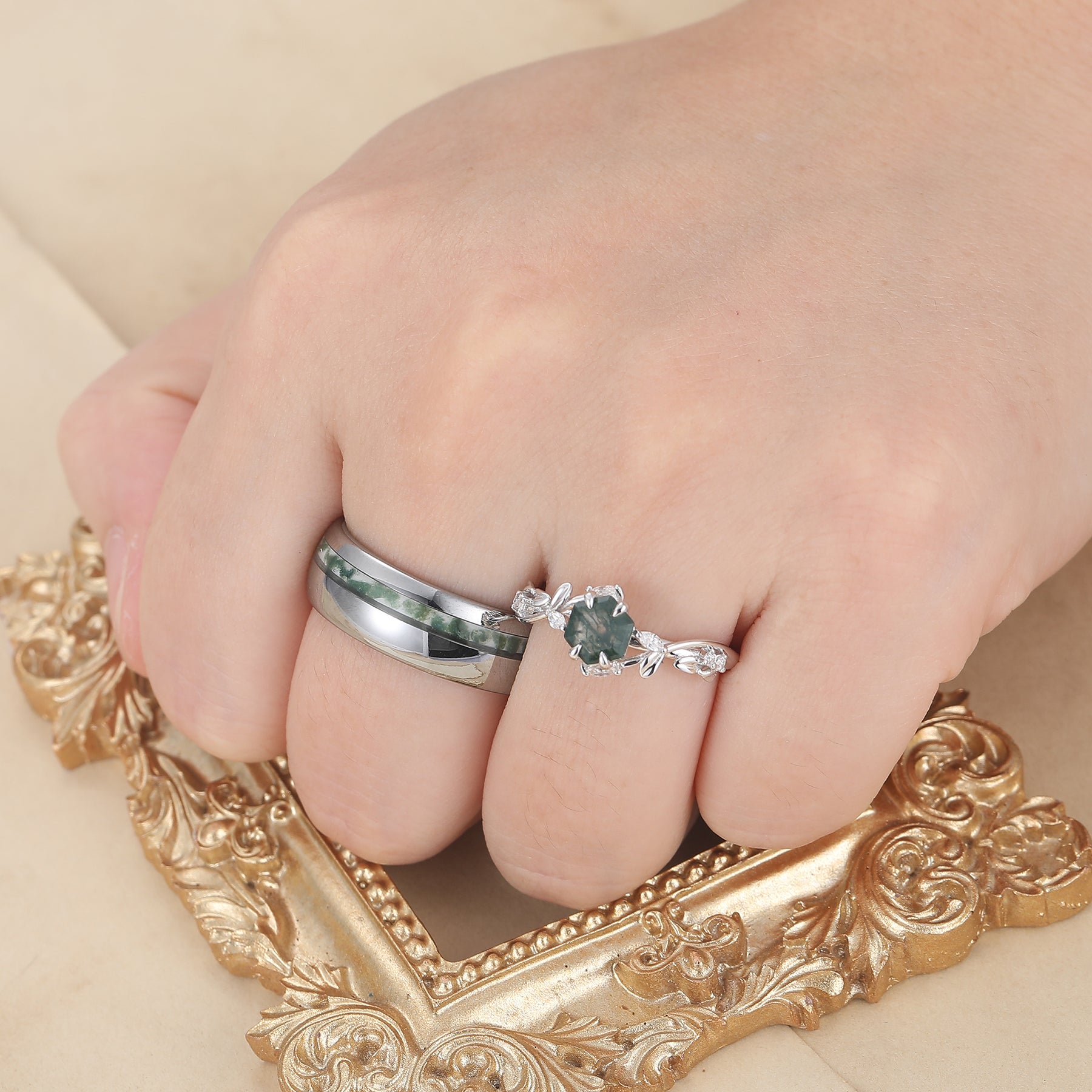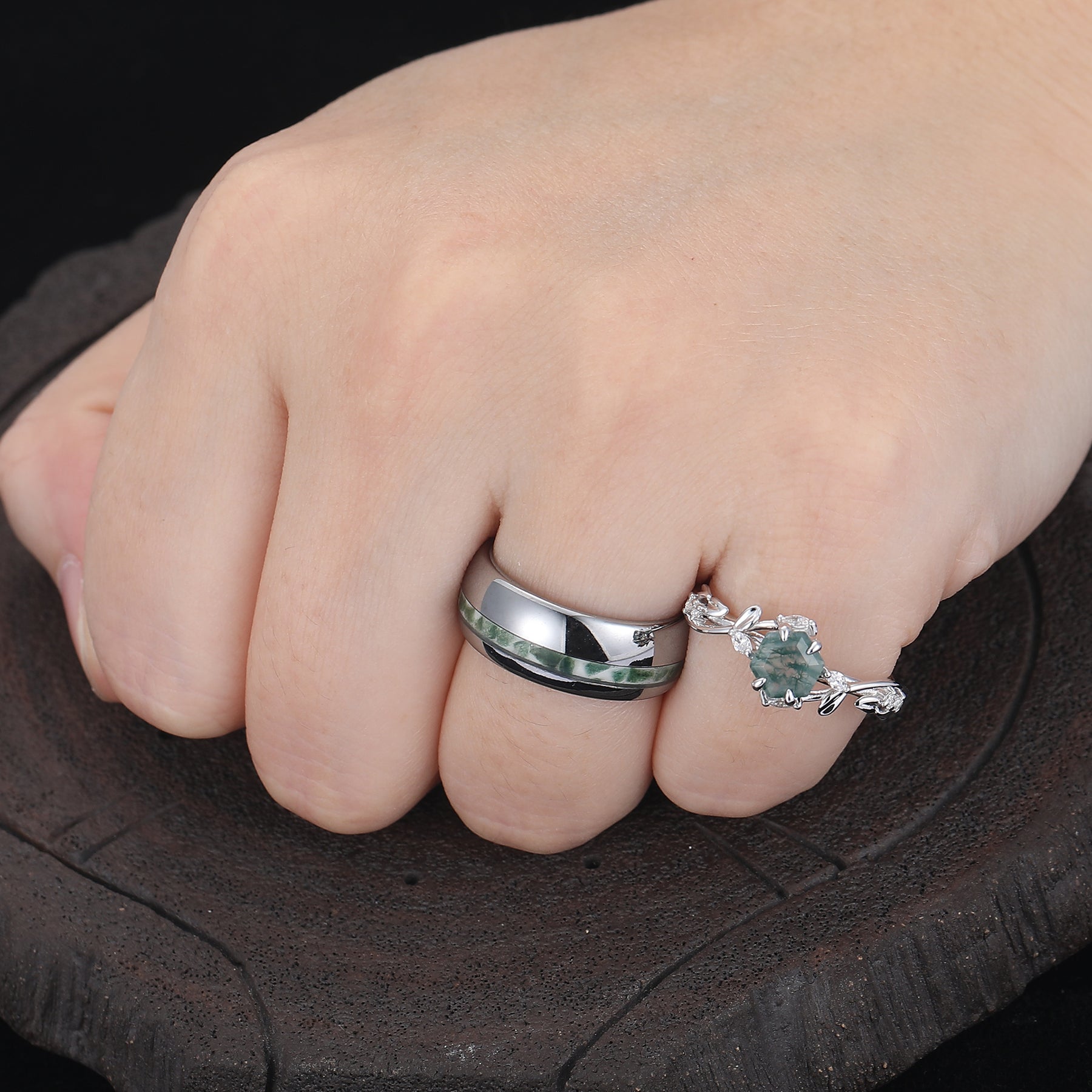 Set di anelli abbinati per coppia con design personalizzato di rami in agata muschio verde, per lui e per lei