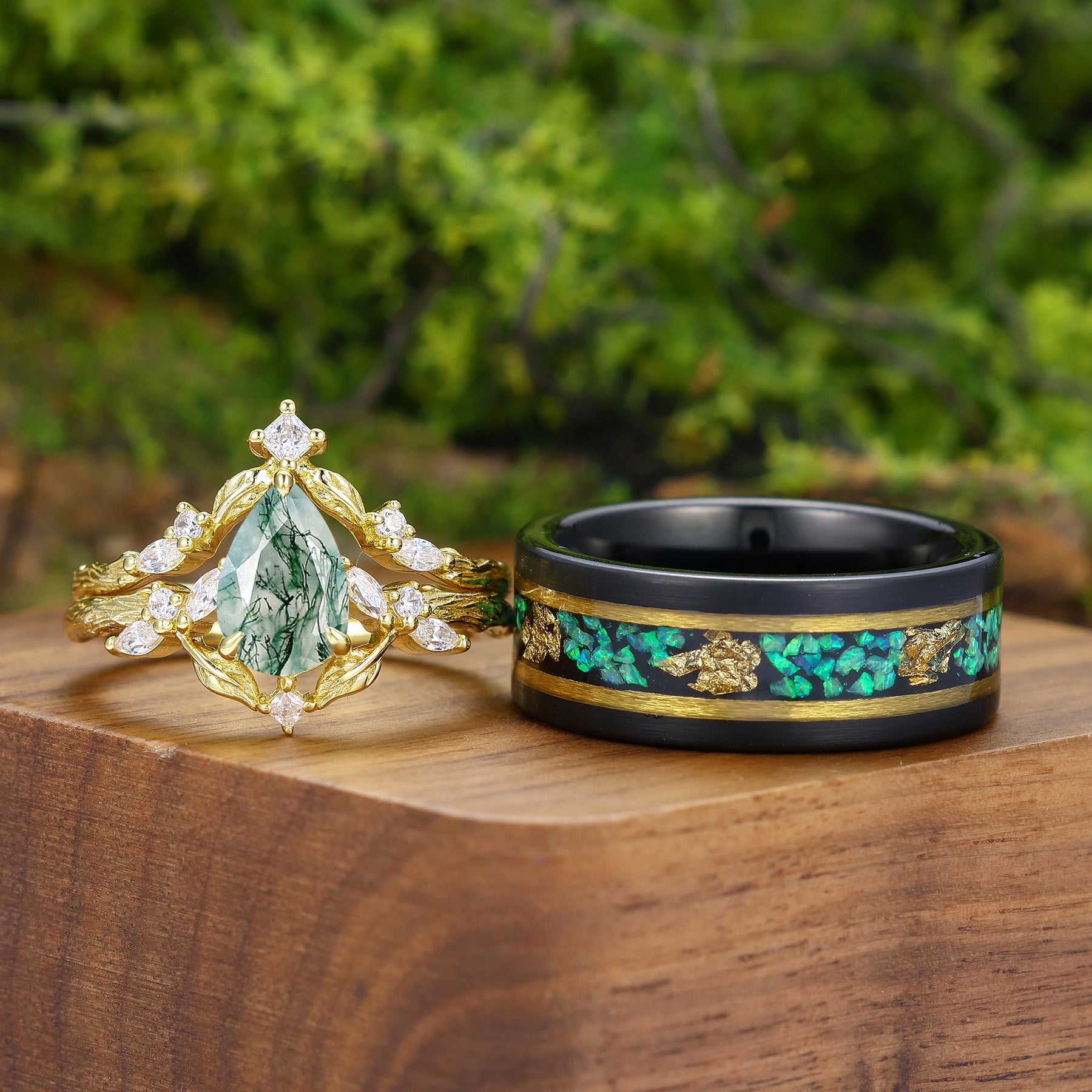 Unique Moss Agate Branch Design Set di Anelli per Coppia Anelli Verde Smeraldo Lui e Lei