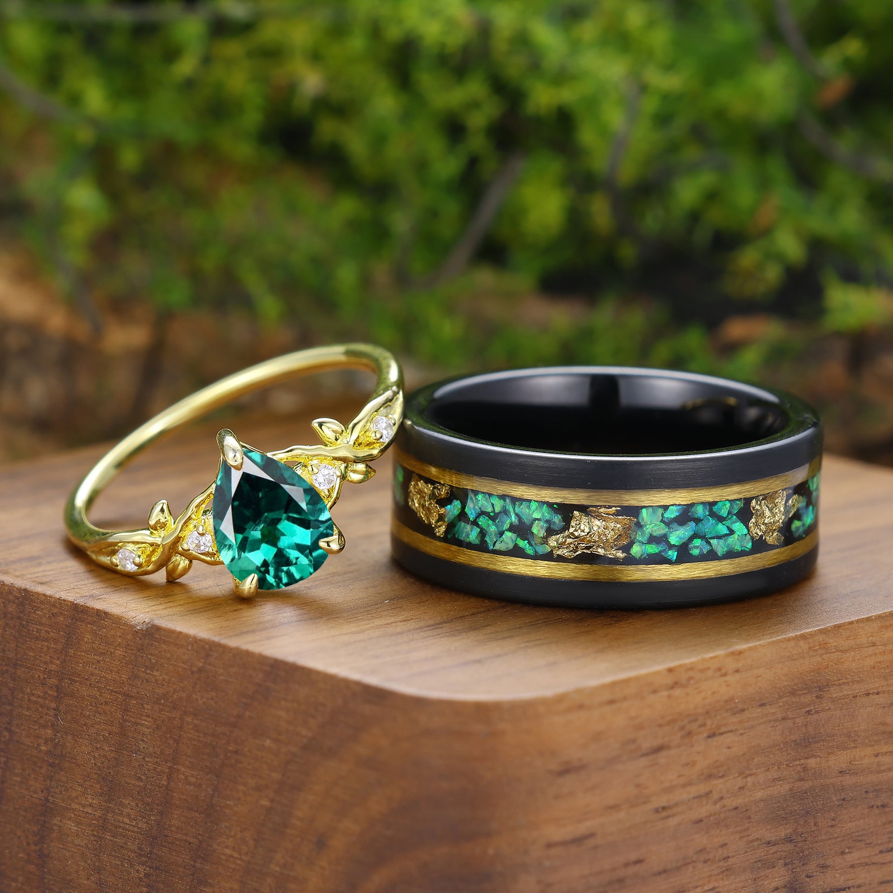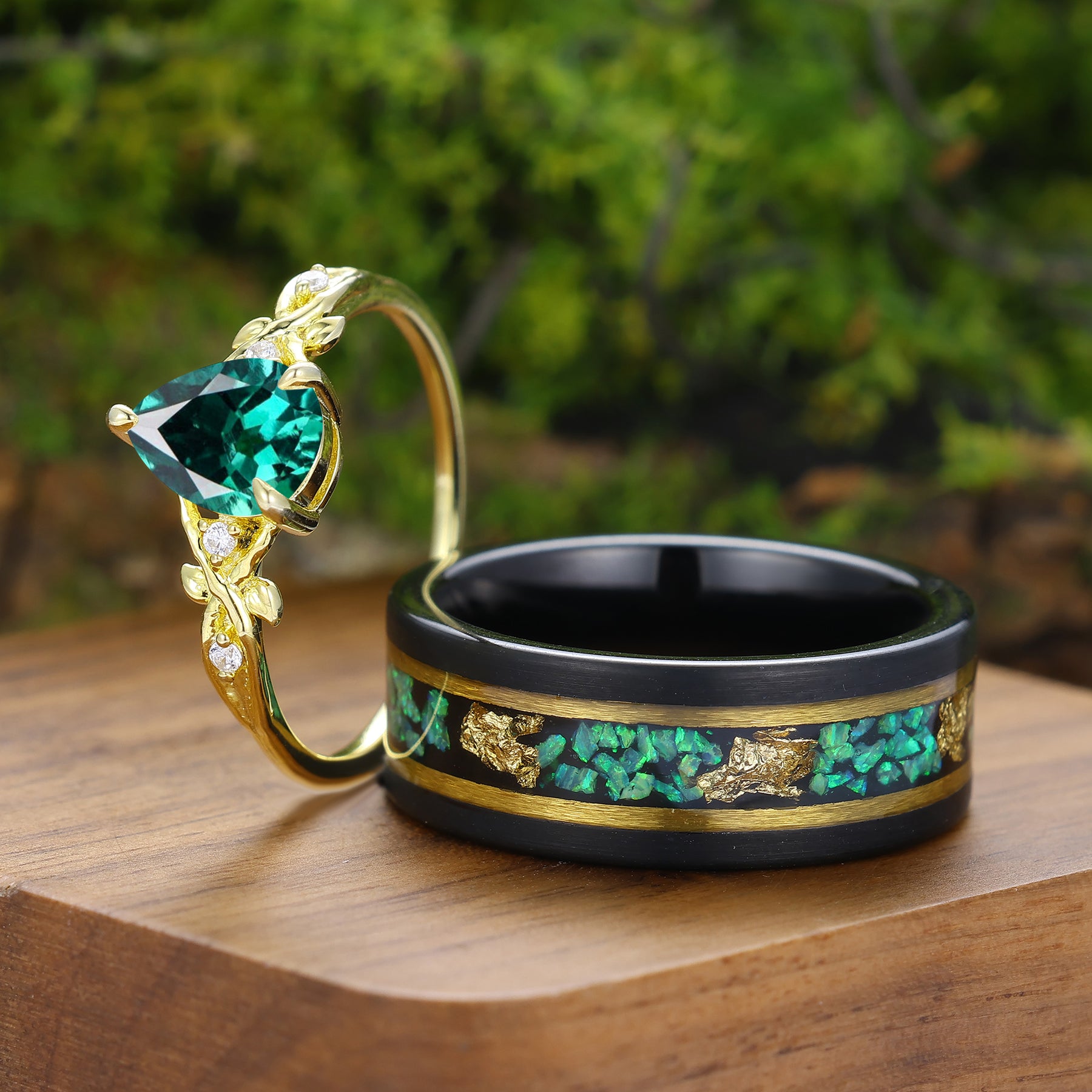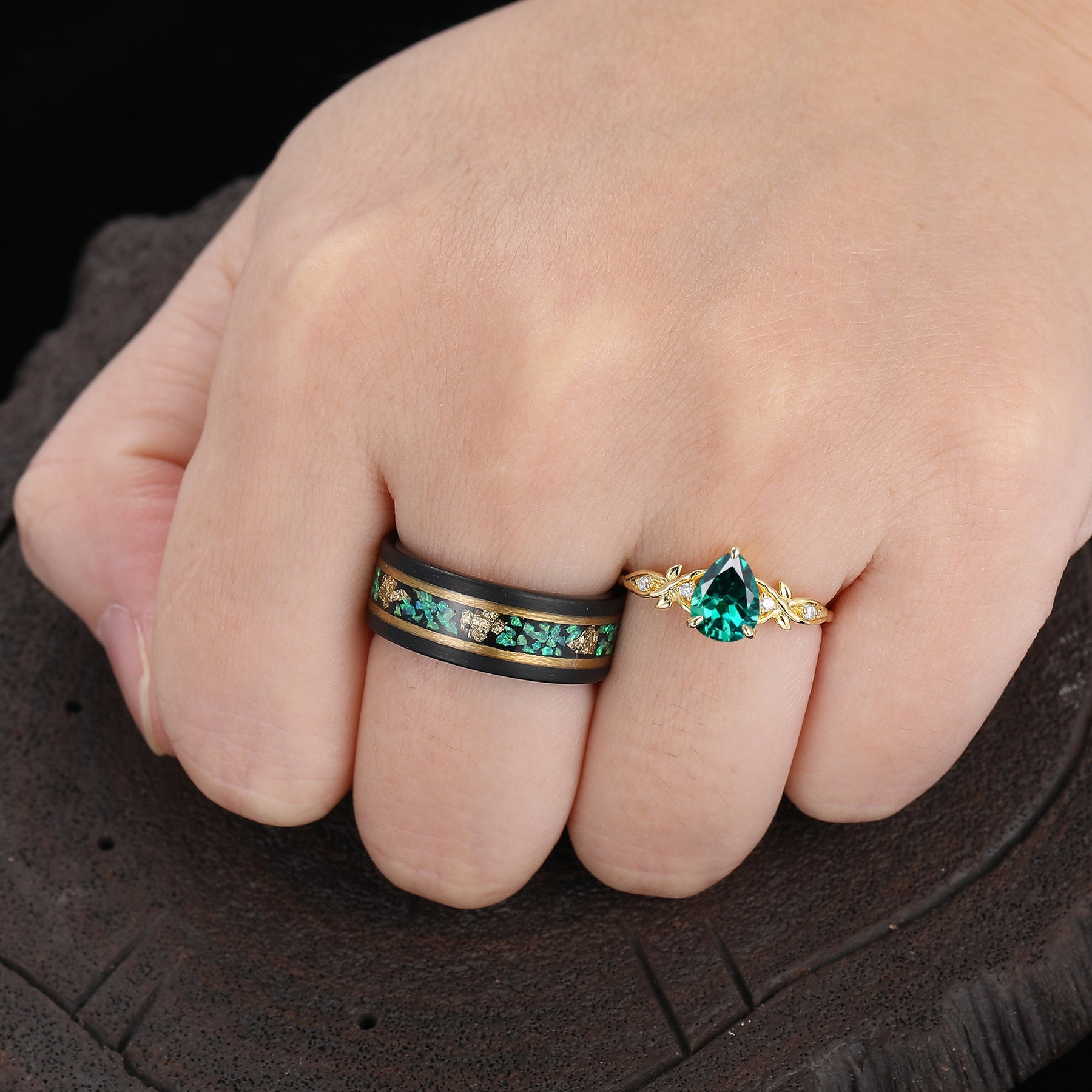 Anelli Coppia Rametto di Foglia di Smeraldo Verde Anelli Coordinati Verdi per Donna e Uomo