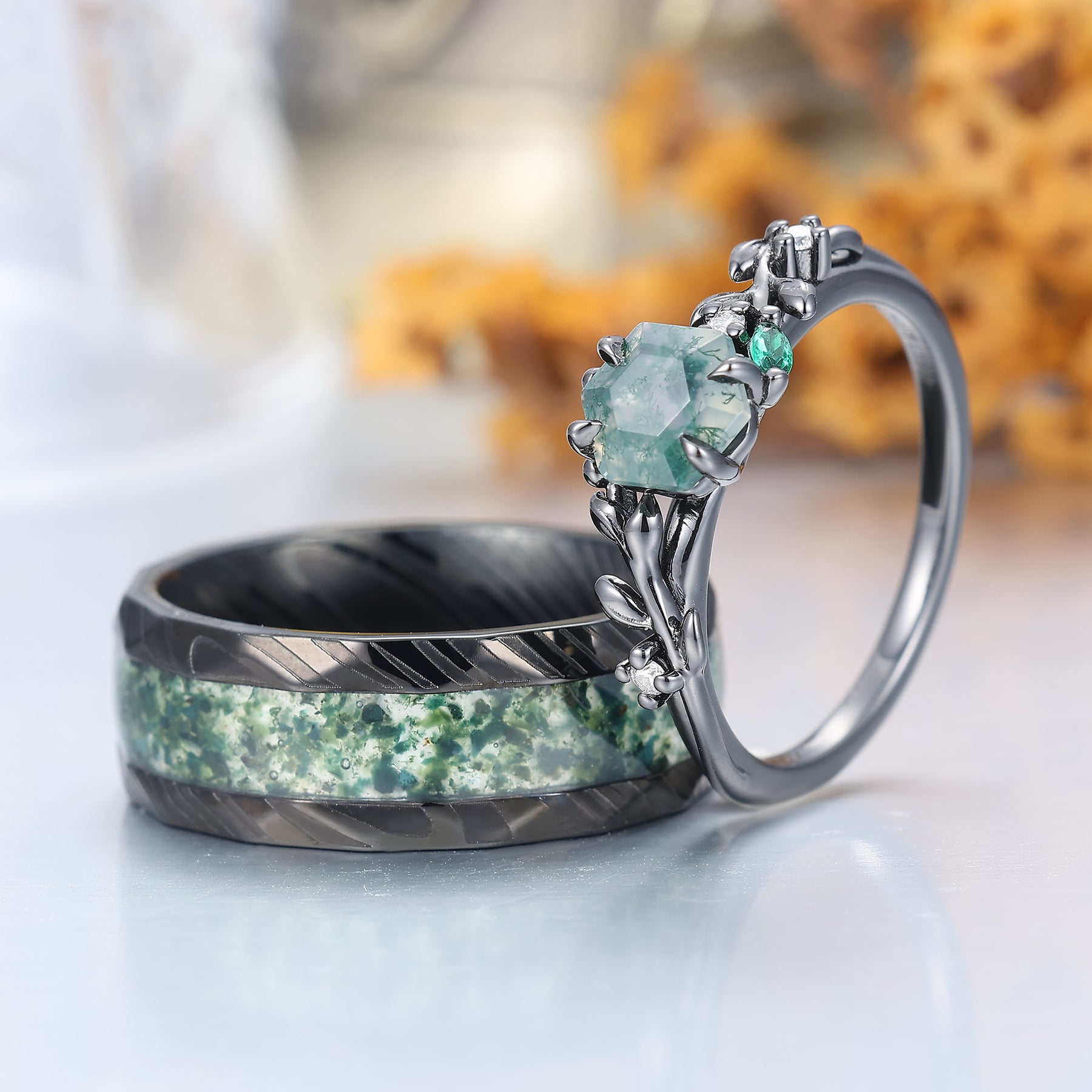 Anelli di Fidanzamento Coppia in Agata Muschio con Rametto Squisito Anello di Promessa in Acciaio Damascato Fedi Nuziali Lui e Lei