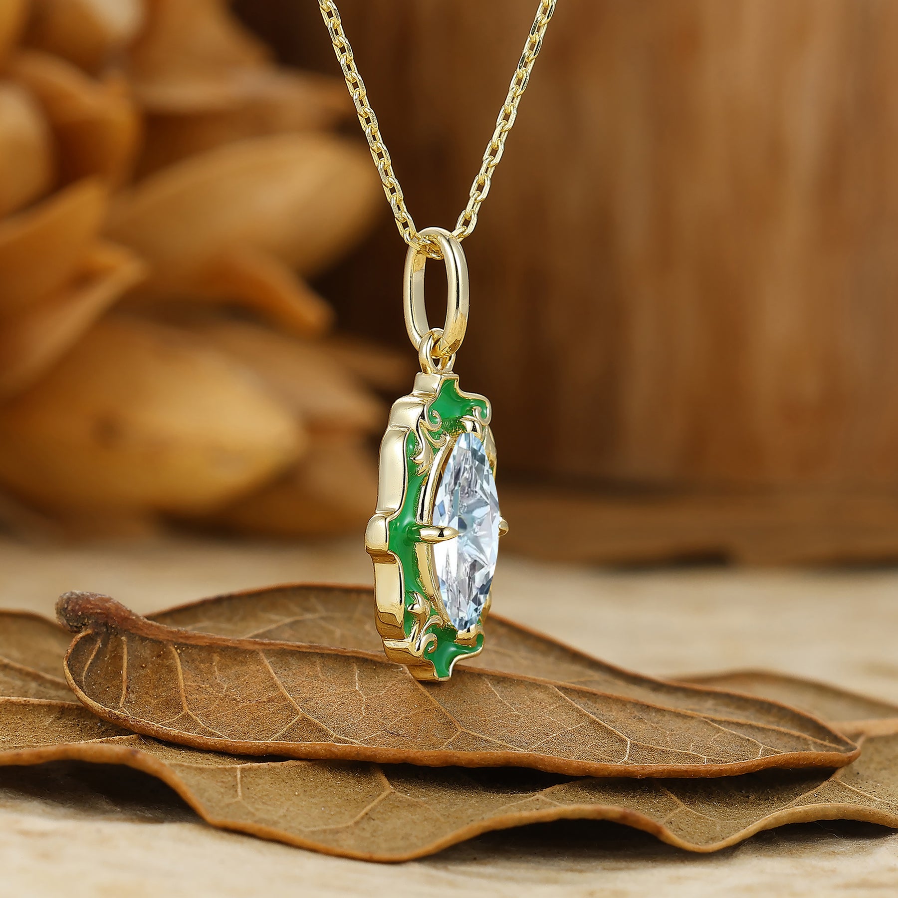Retro Aquamarine Filigree Pendant Necklace with Green Resin Coating