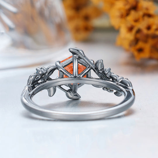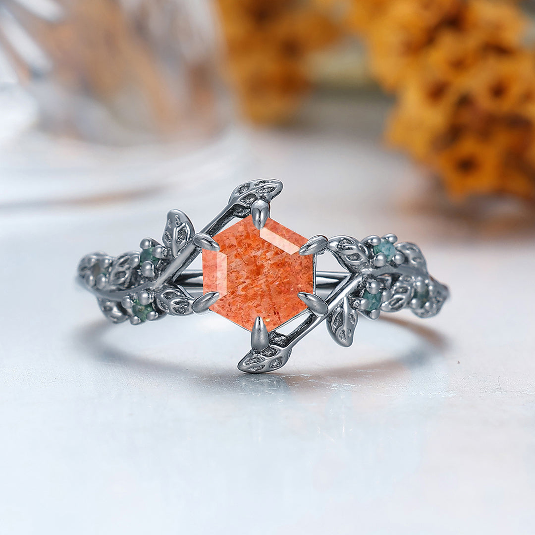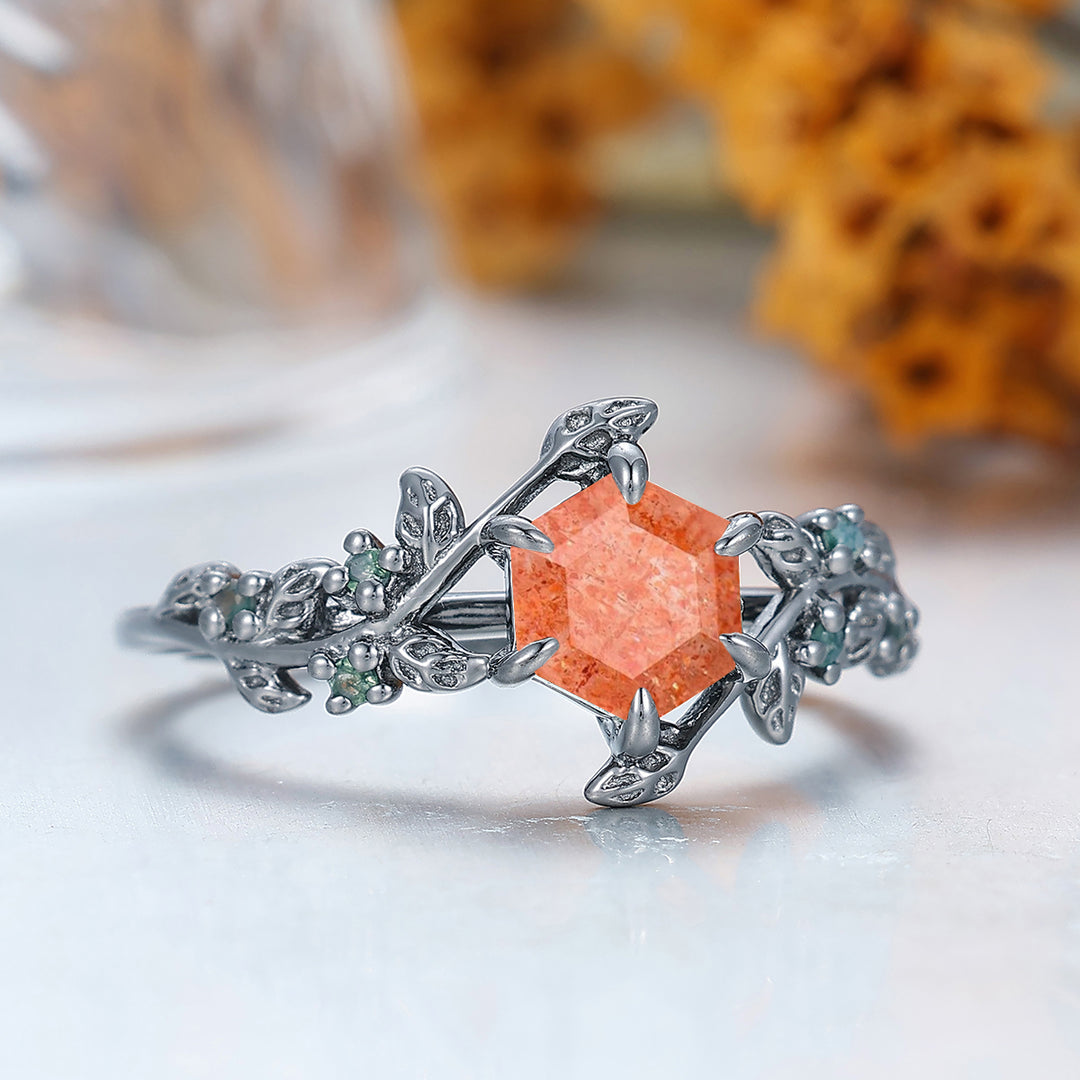 0.85CT Hexagon Cut Leaf Natural Sunstone Engagement Ring Moss Agate Inlaid Bridal Ring - Esdomera