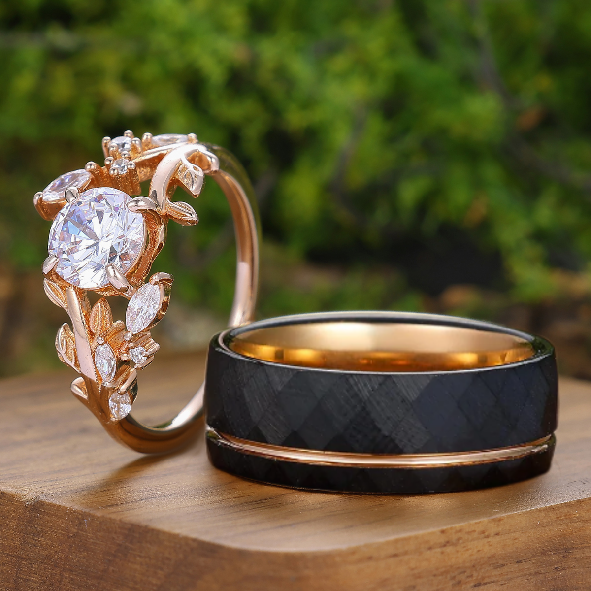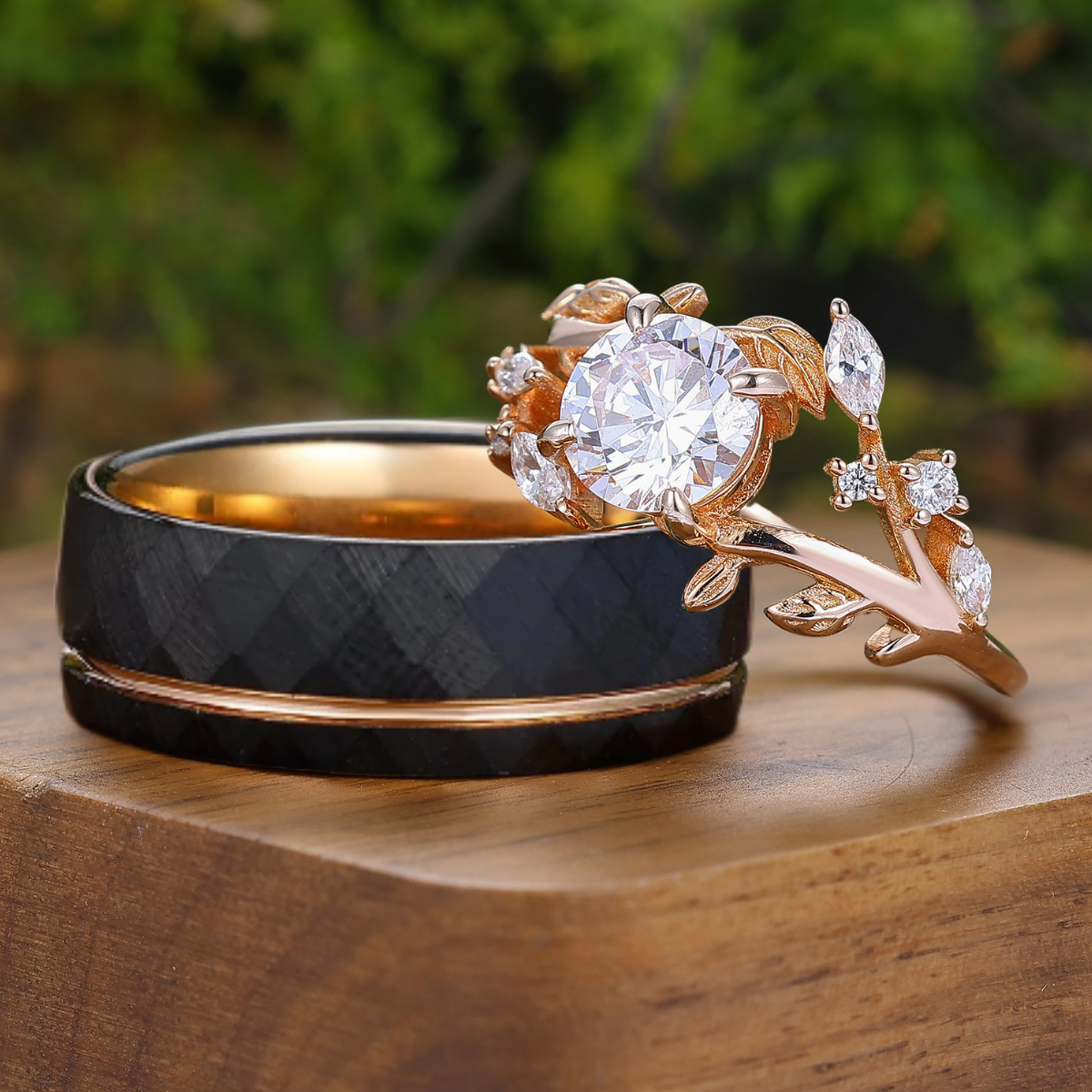 1,25CT Anello Coppia Inciso a Foglia con Moissanite Rotonda in Argento Sterling e Tungsteno Anelli Coordinati