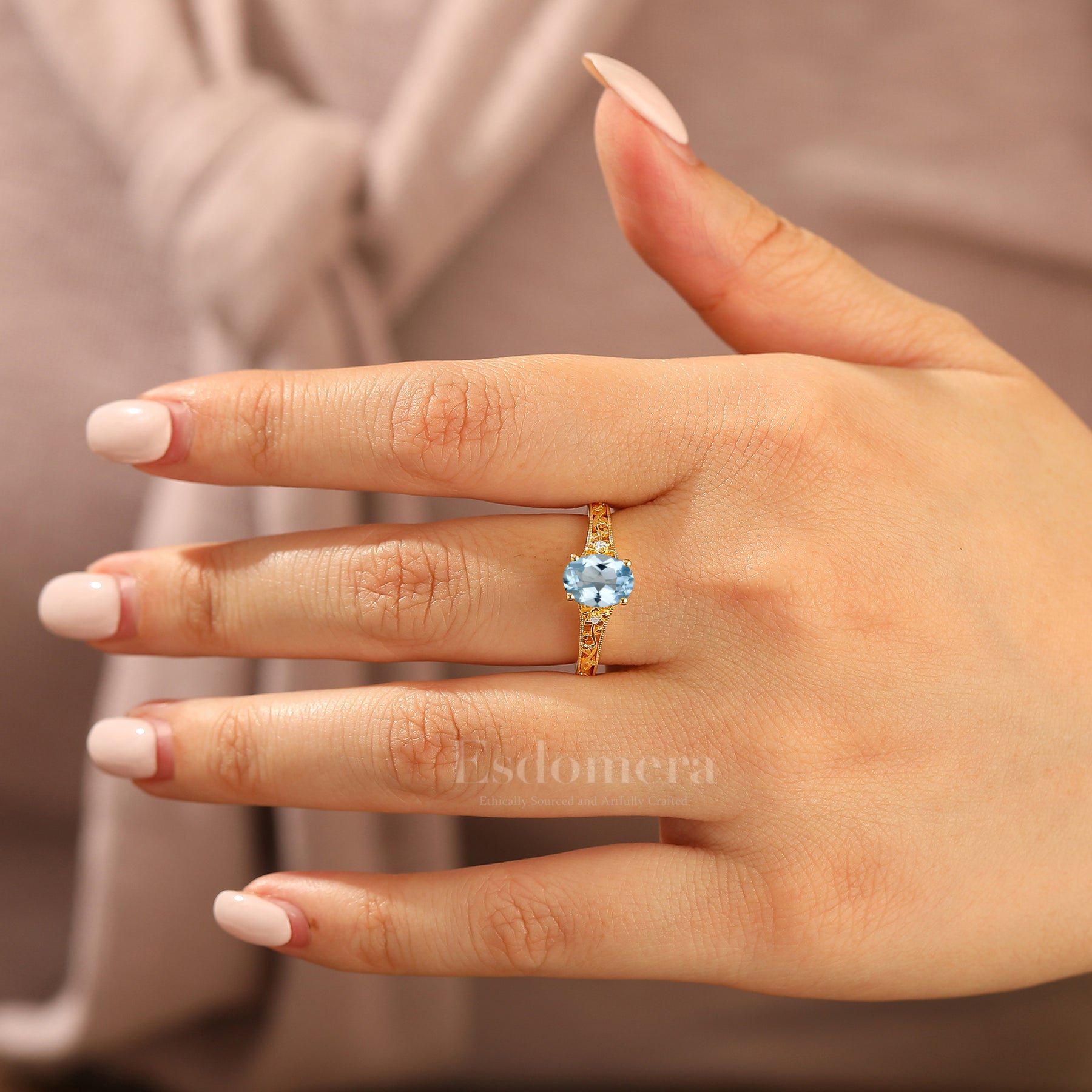 14k Yellow Gold Ornate Filigree Shank Ring Vintage Oval Cut Aquamarine Engagement Rings Carved Vine Bridal Ring