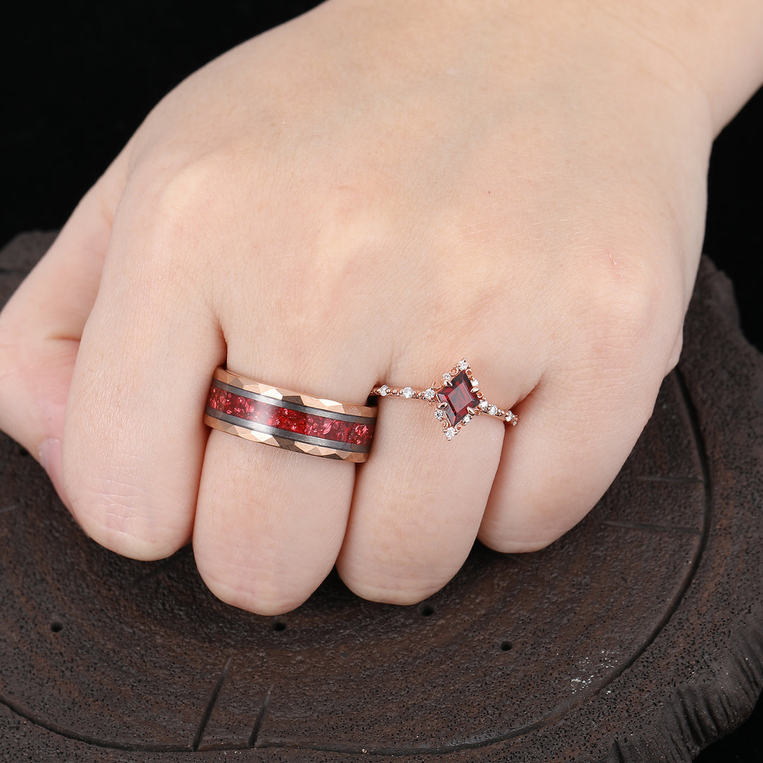 Fedi nuziali abbinate in tungsteno per coppia — anelli di fidanzamento/di promessa con granato rosso a taglio rombo artistico, per lui e per lei
