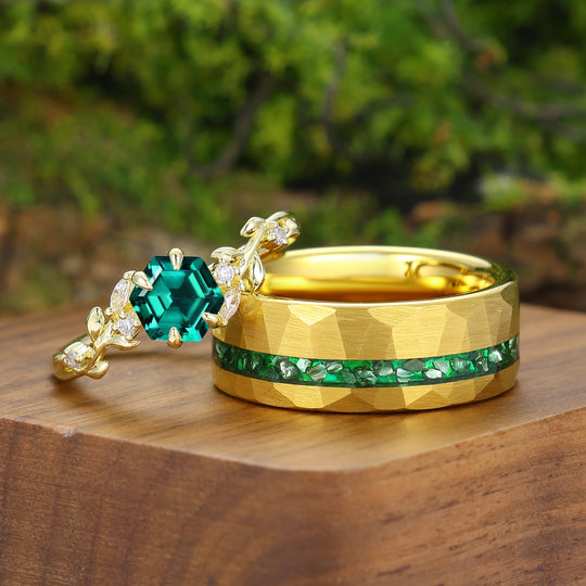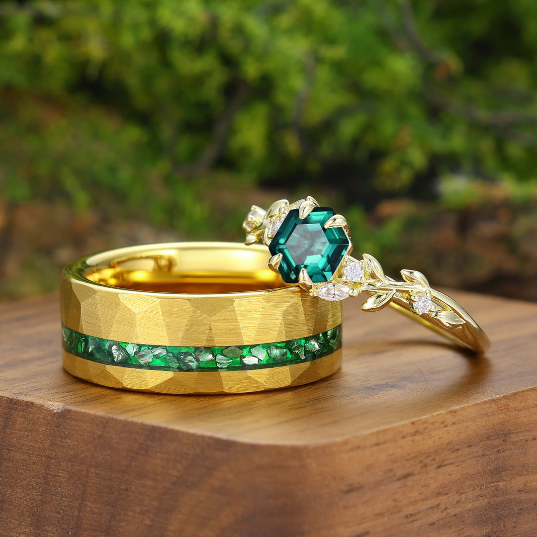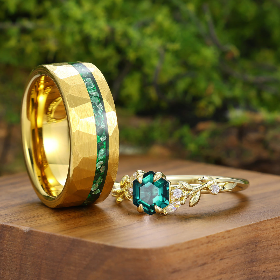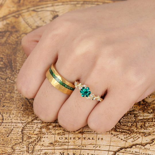 Anelli Coppia Ispirati alla Natura Smeraldo Esagonale Verde Anello Coordinato Lui e Lei