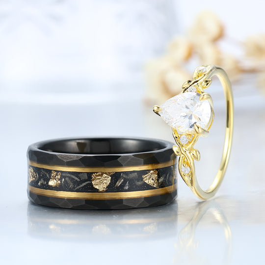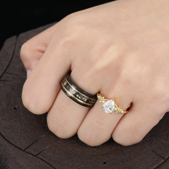 Anello da coppia ispirato a foglia con moissanite taglio pera, placcato in oro giallo, set di anelli per lui e per lei