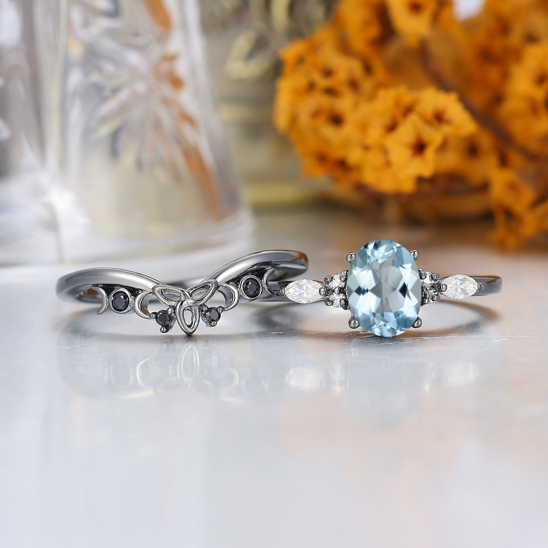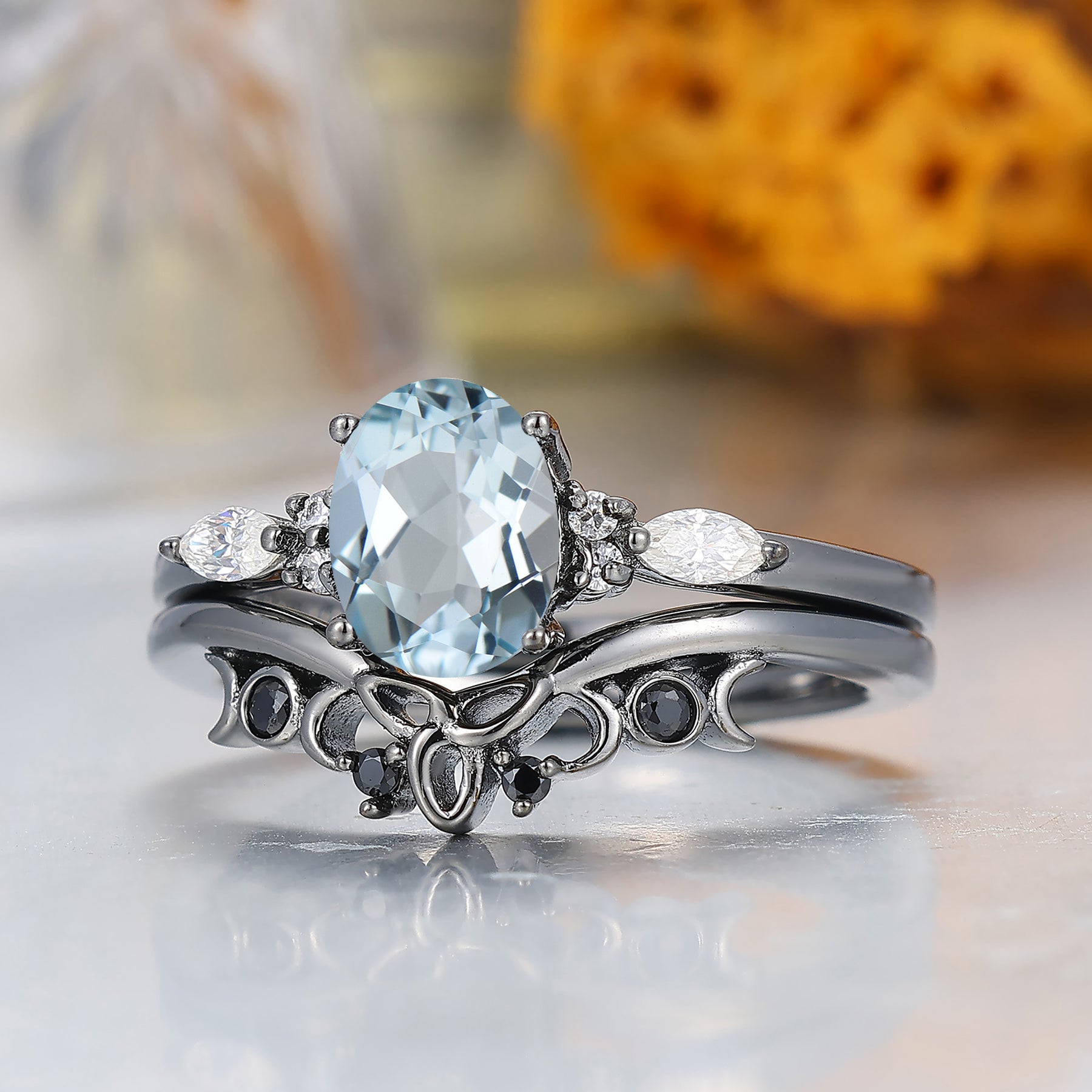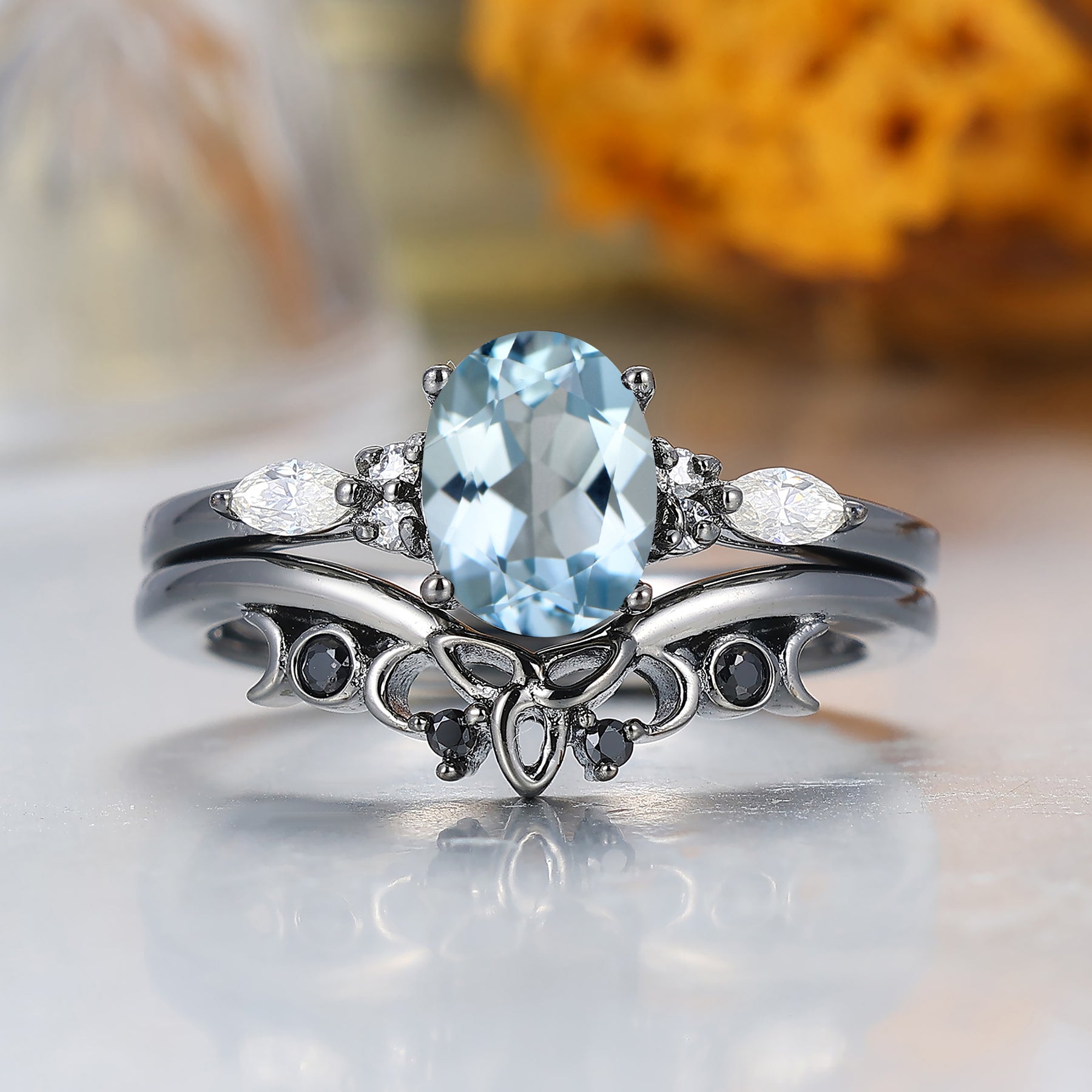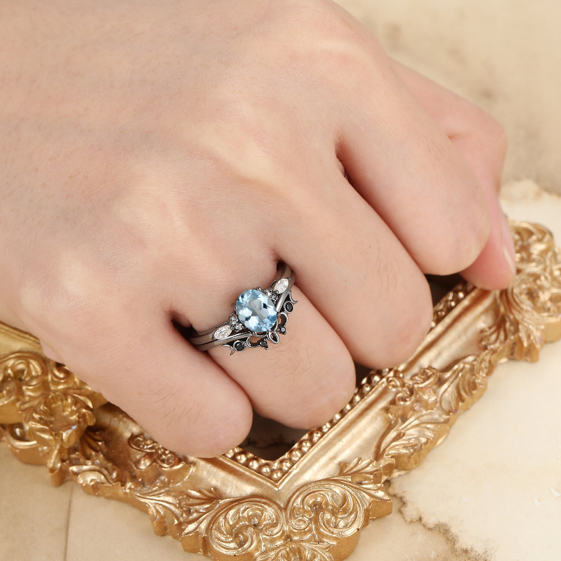 Fijne Ovale Geslepen Aquamarijn Verlovingsring Unieke Zwart Vergulde Aquamarijn Damesringen