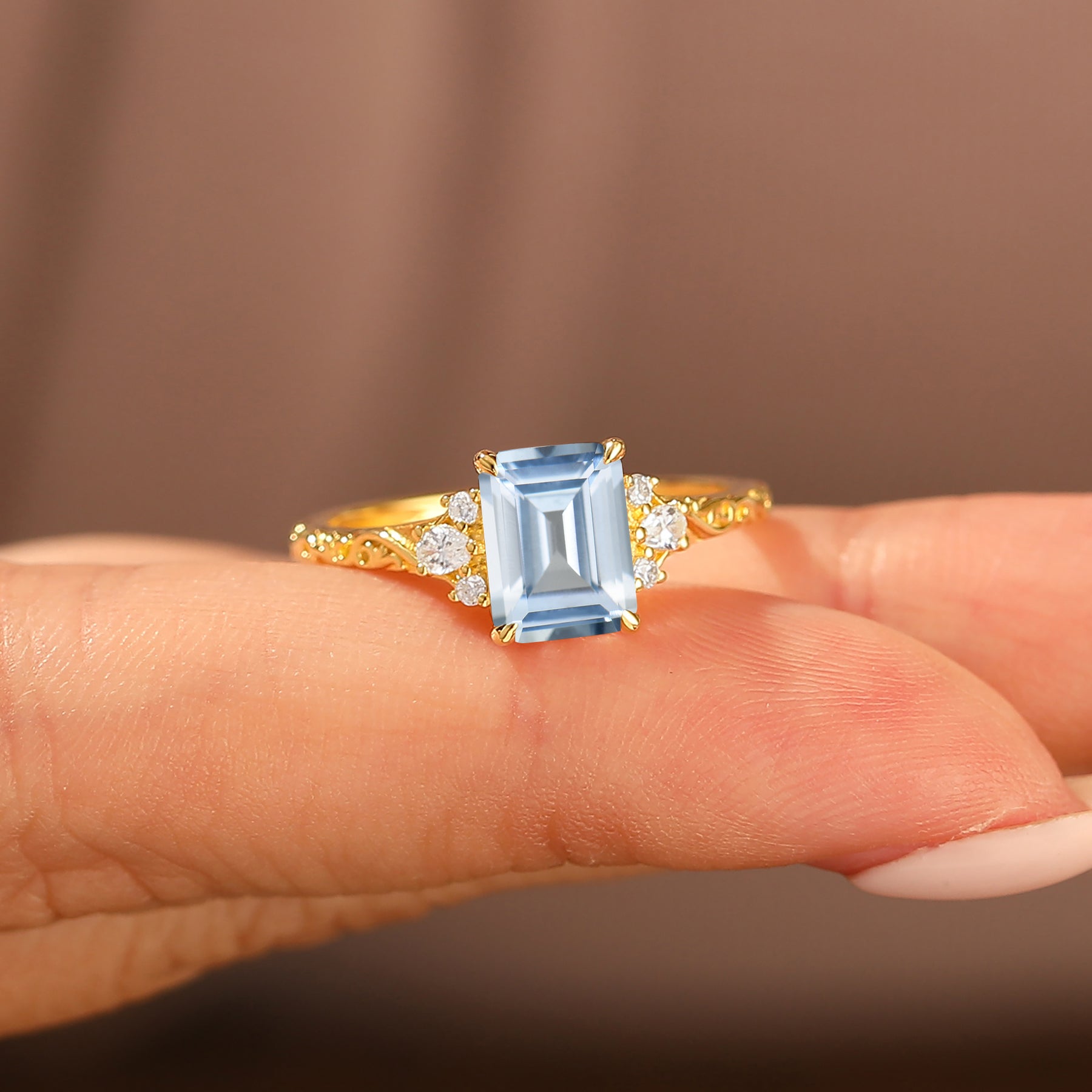 Unieke 2CT Blad-geïnspireerde Smaragdslijpvormige 14K Geelgouden Aquamarijn Verlovingsring Filigraan Trouwring