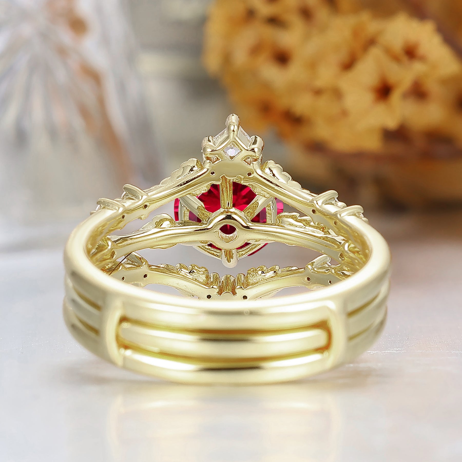 Dainty Leaf Design Ruby Bridal Anniversary Ring Set Antique Ring For Women