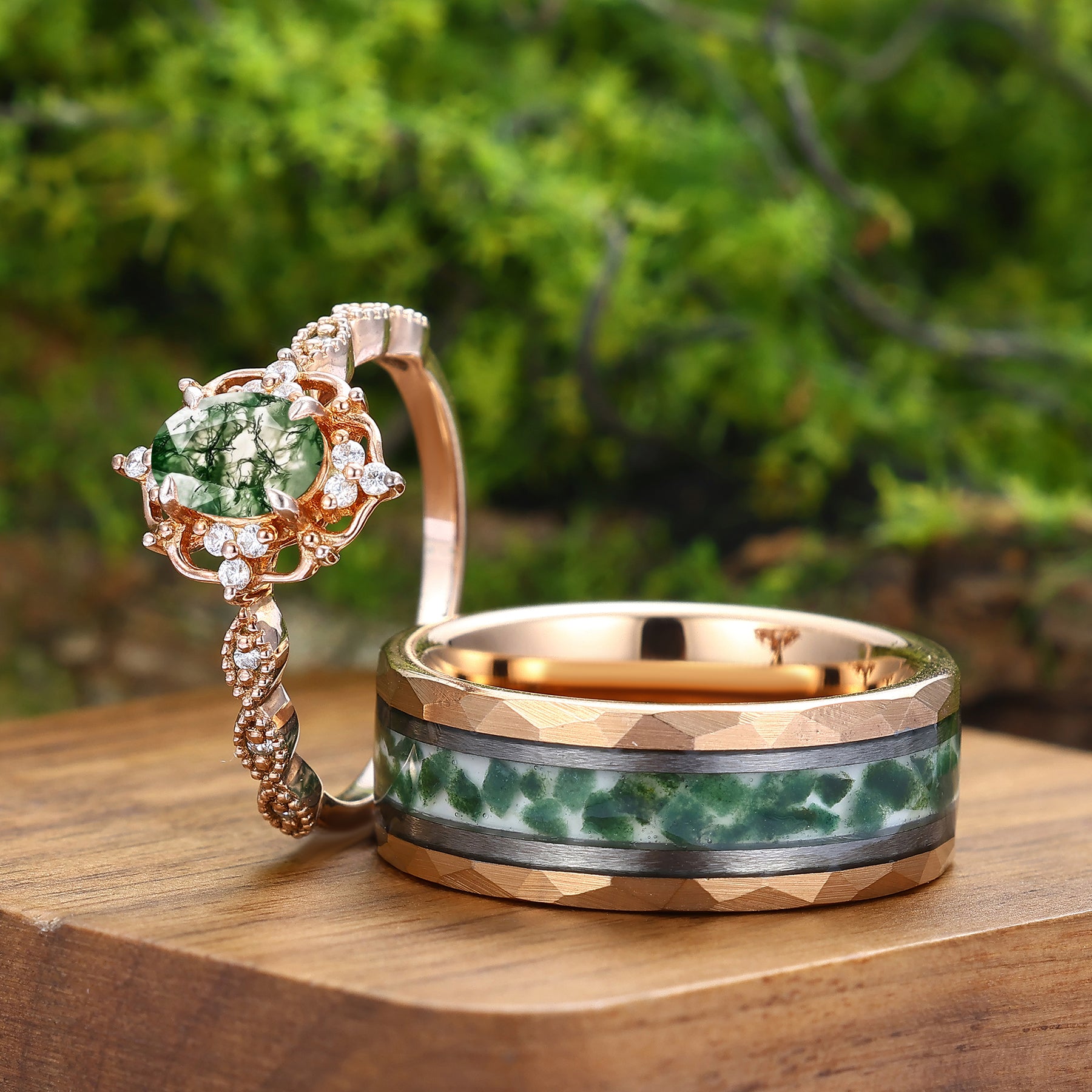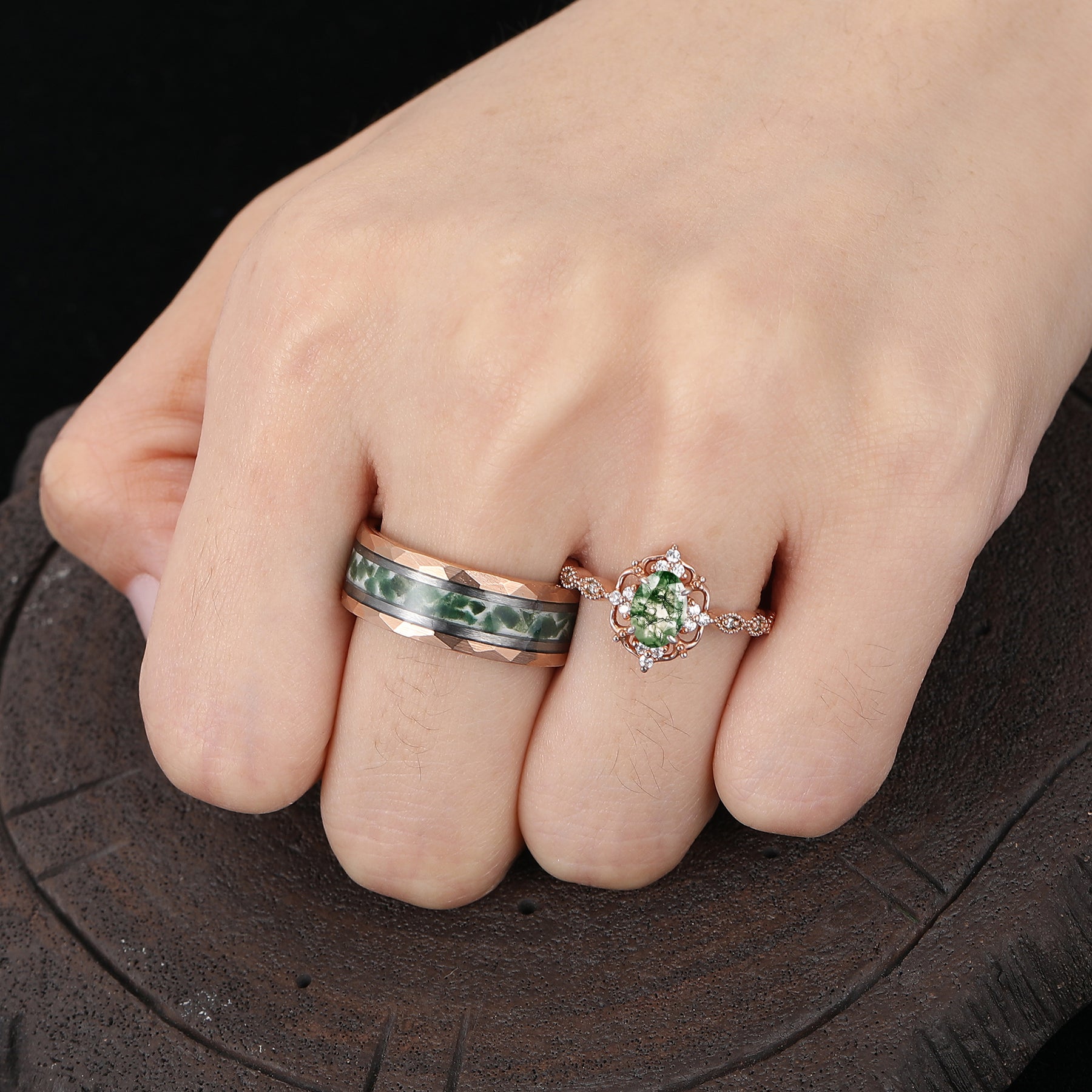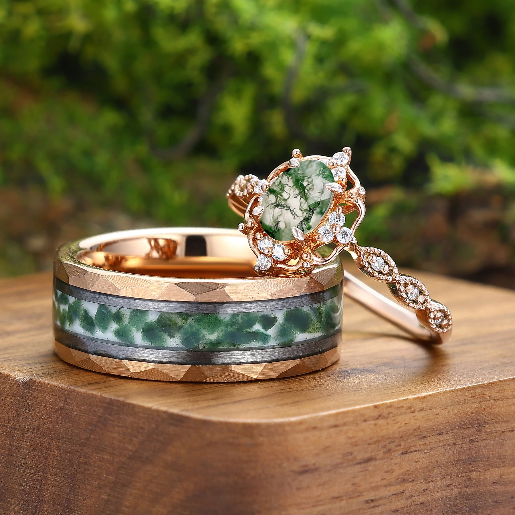 Antieke natuurlijke mosagaat bloemenring met bijpassende gehamerde wolfraam ringen – set voor koppels
