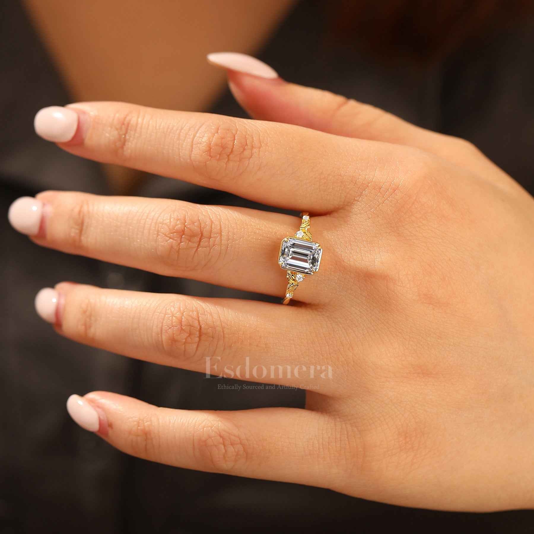 Antieke Vine Emerald Lab Grown Diamanten Trouwring Gegraveerde Blad Bruidsring (IGI Gecertificeerd)