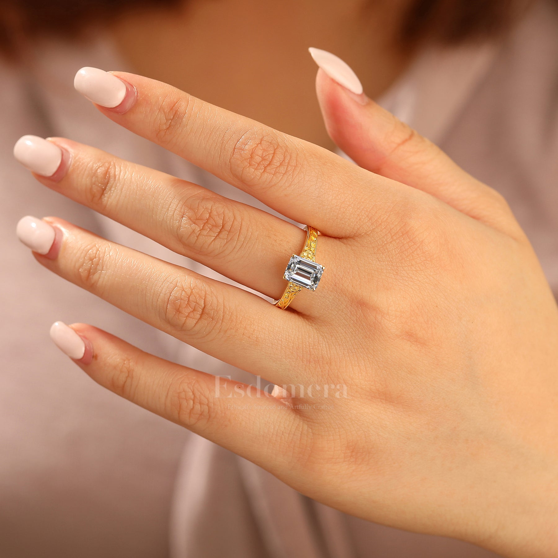 Floral Vine Relief Design Emerald Cut Lab Grown Diamond Ring Botanische Handgemaakte Damesring (IGI Gecertificeerd)