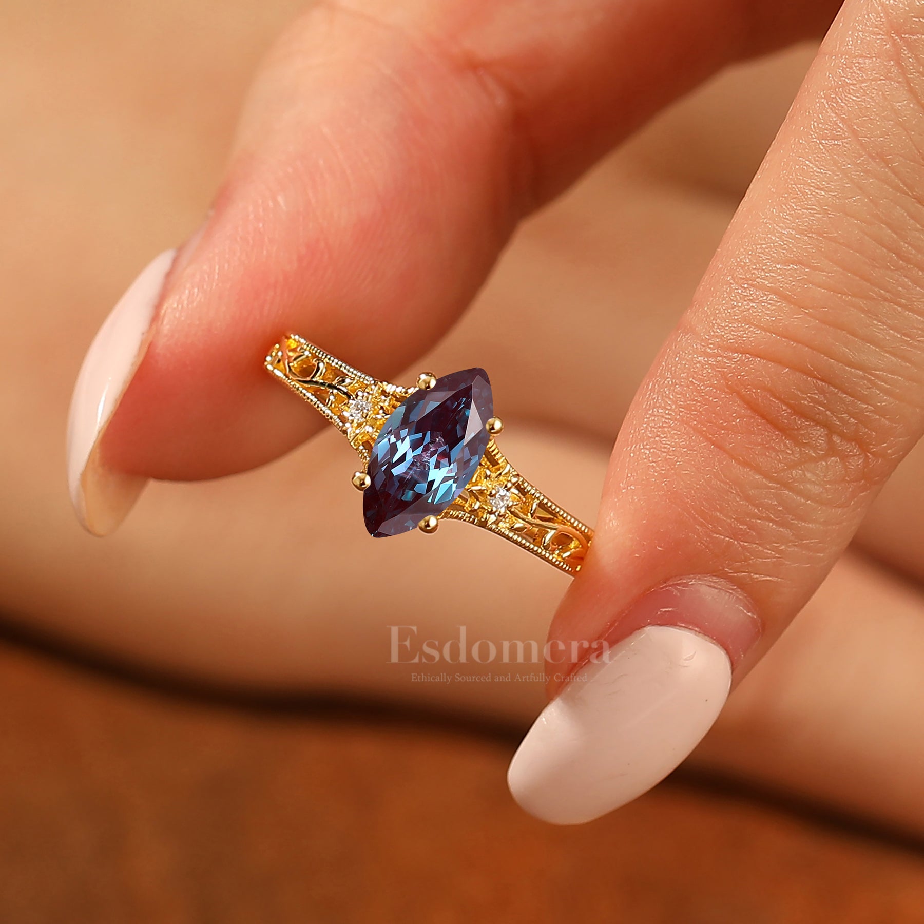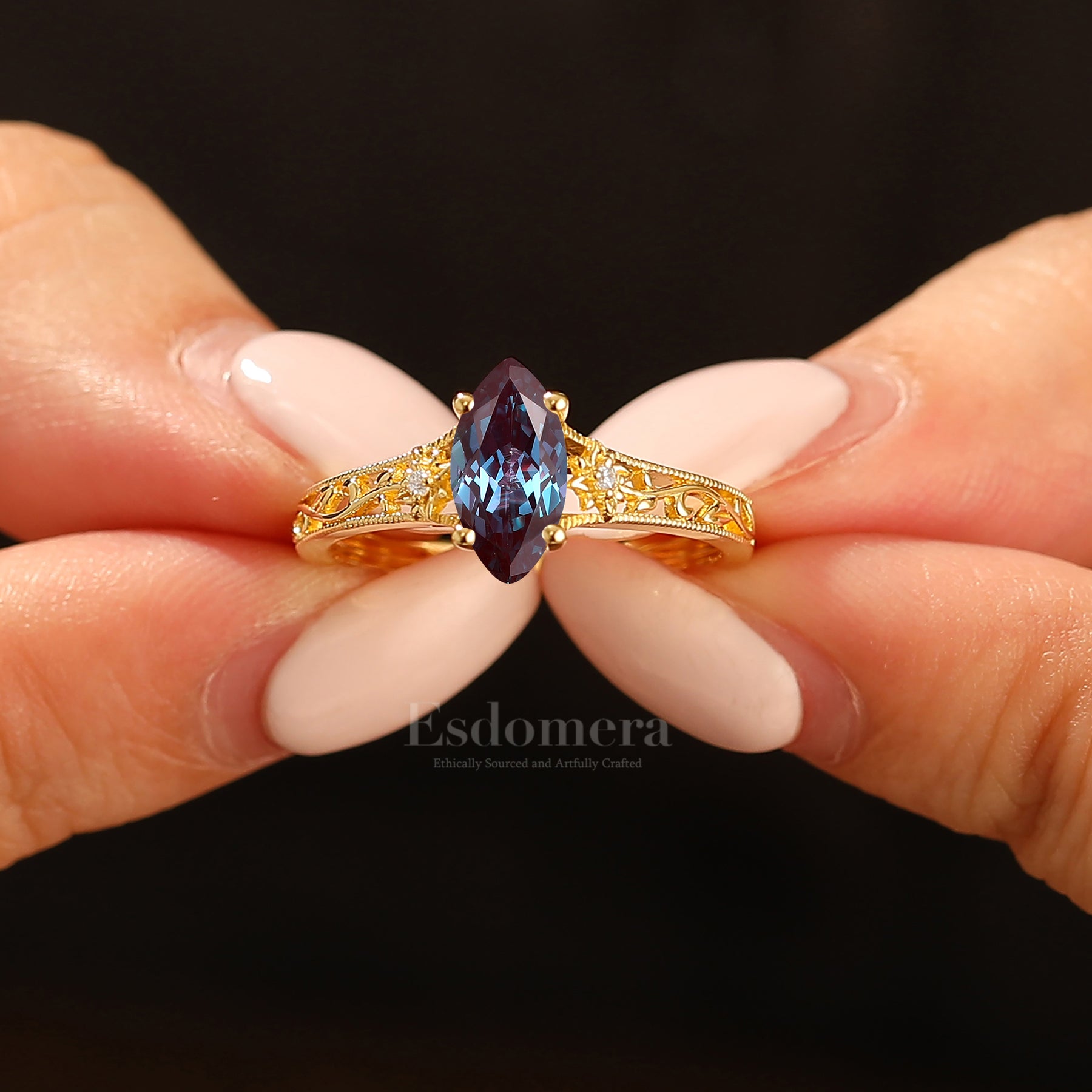Opengewerkt filigraan ring met marquise geslepen alexandriet, bloemmotief met wijnrank, geelgouden trouwring