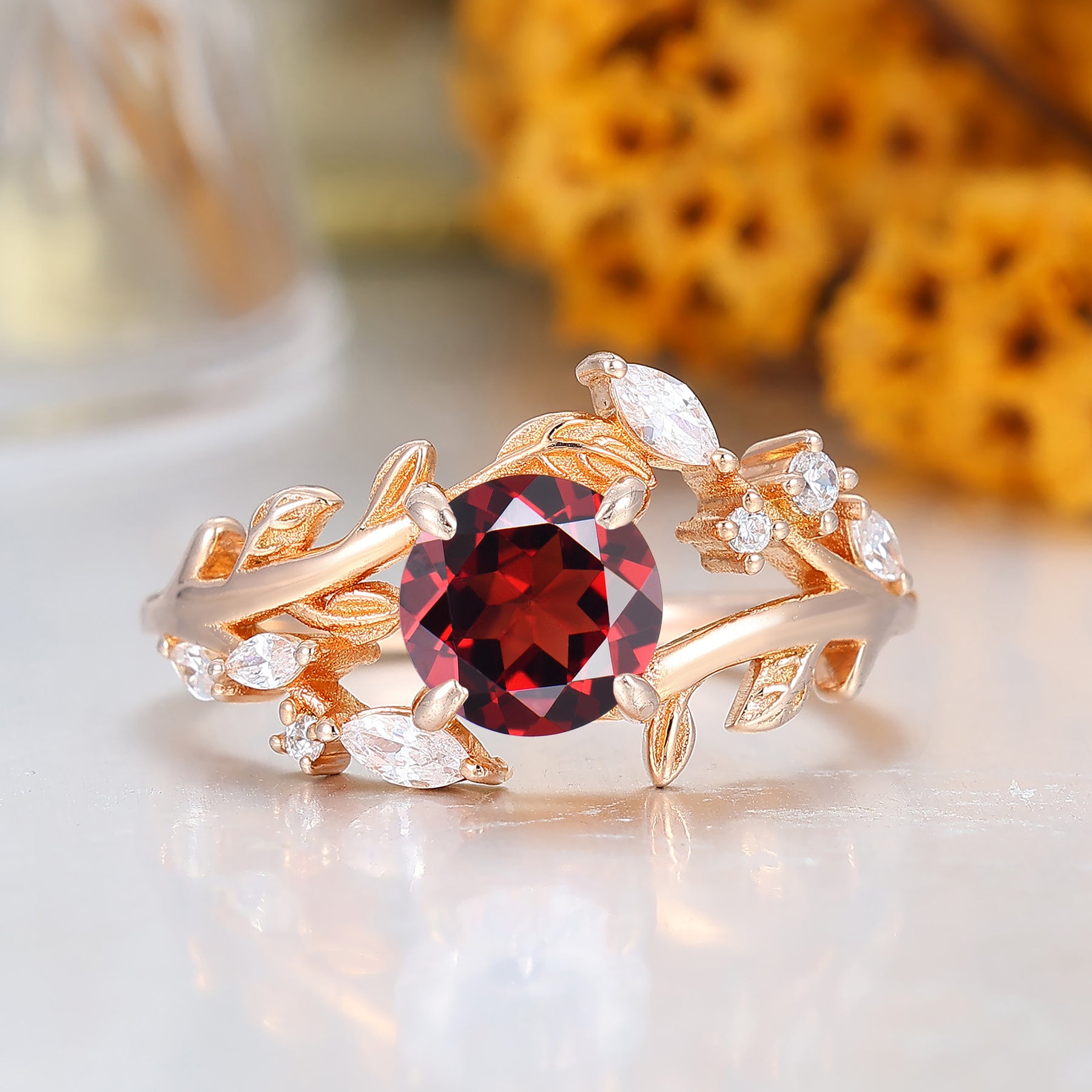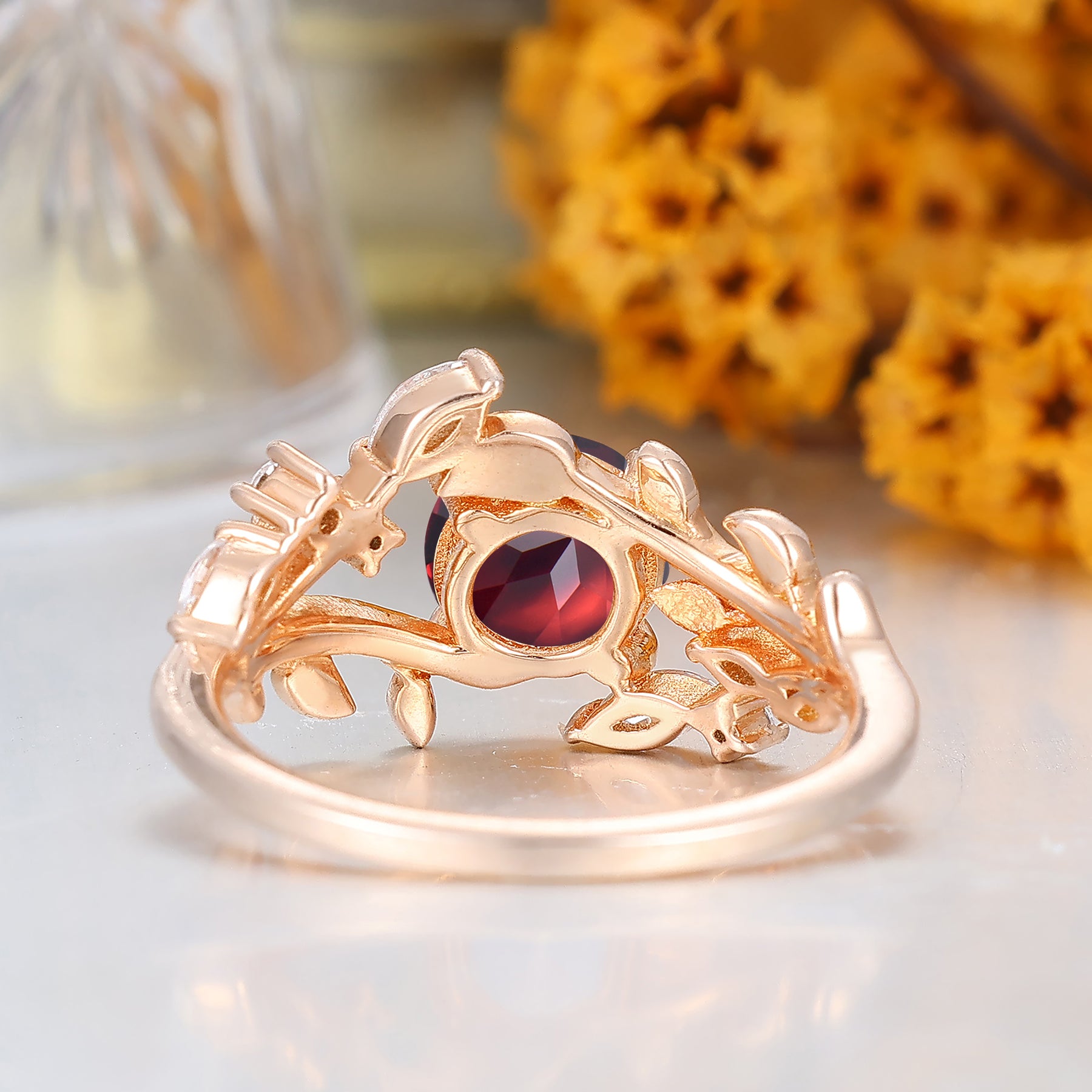 14k roségoud natuurlijke rode granaat ronde slijpvorm natuur geïnspireerde bladrank bypass ring