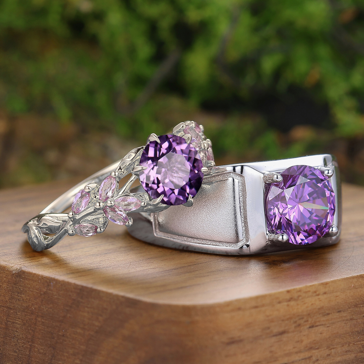 Blad Geïnspireerde Ronde Natuurlijke Amethist Paar Ringen 925 Zilver Zijn En Haar Ringen