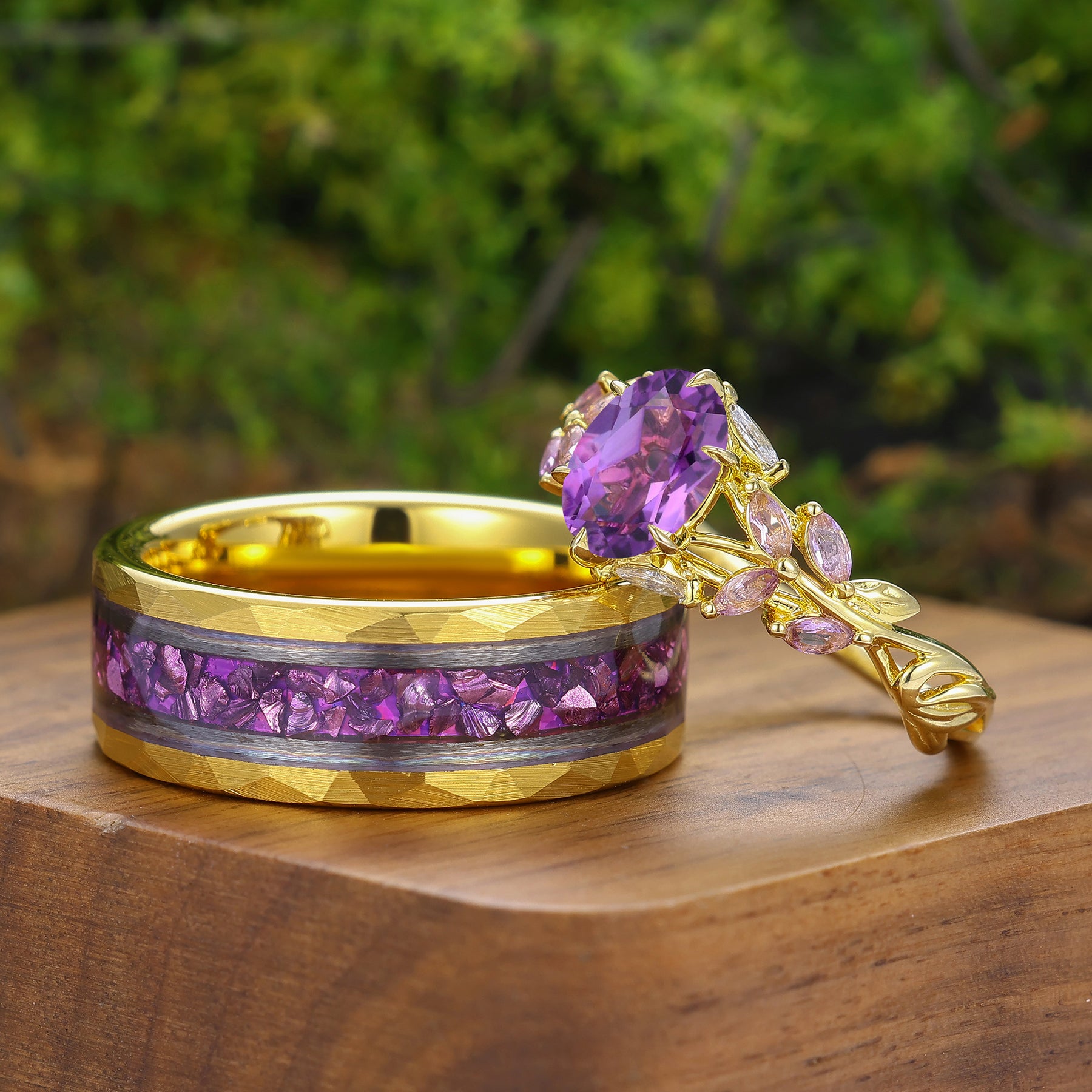 Branch Design Paarse amethist matchende ringen voor hem en haar, geelgoud verguld