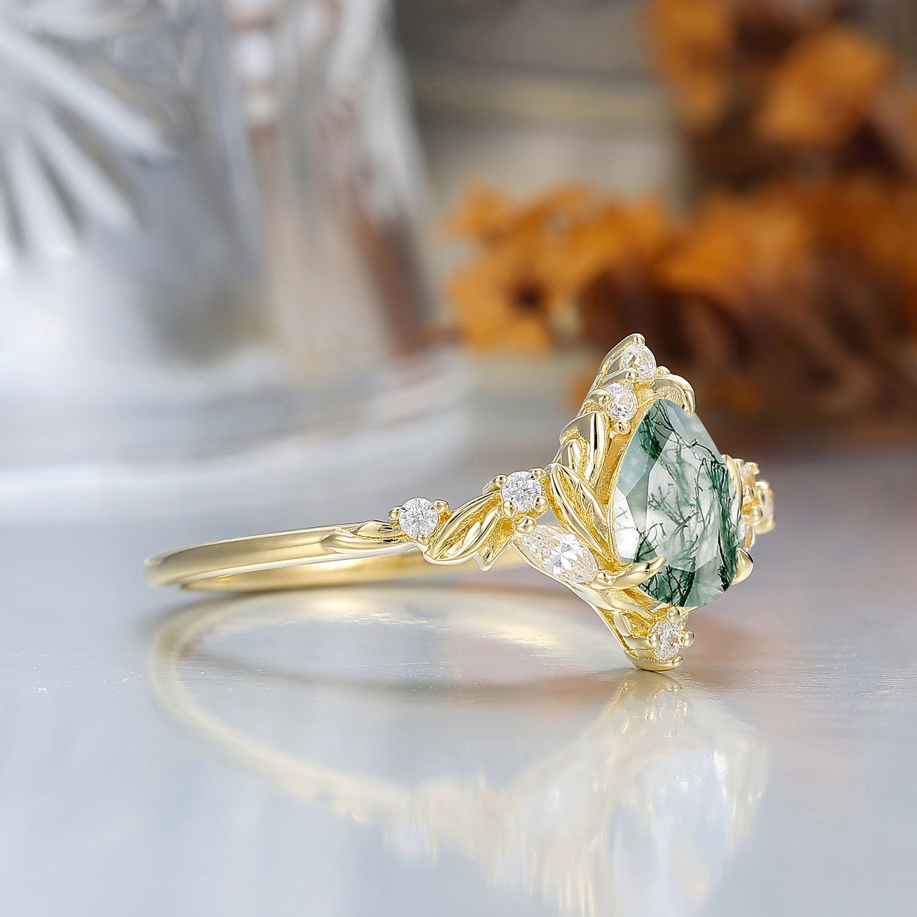 Dainty Pear Cut Moss Agate Engagement Ring Solid Yellow Gold Leaf Engraved Women Ring