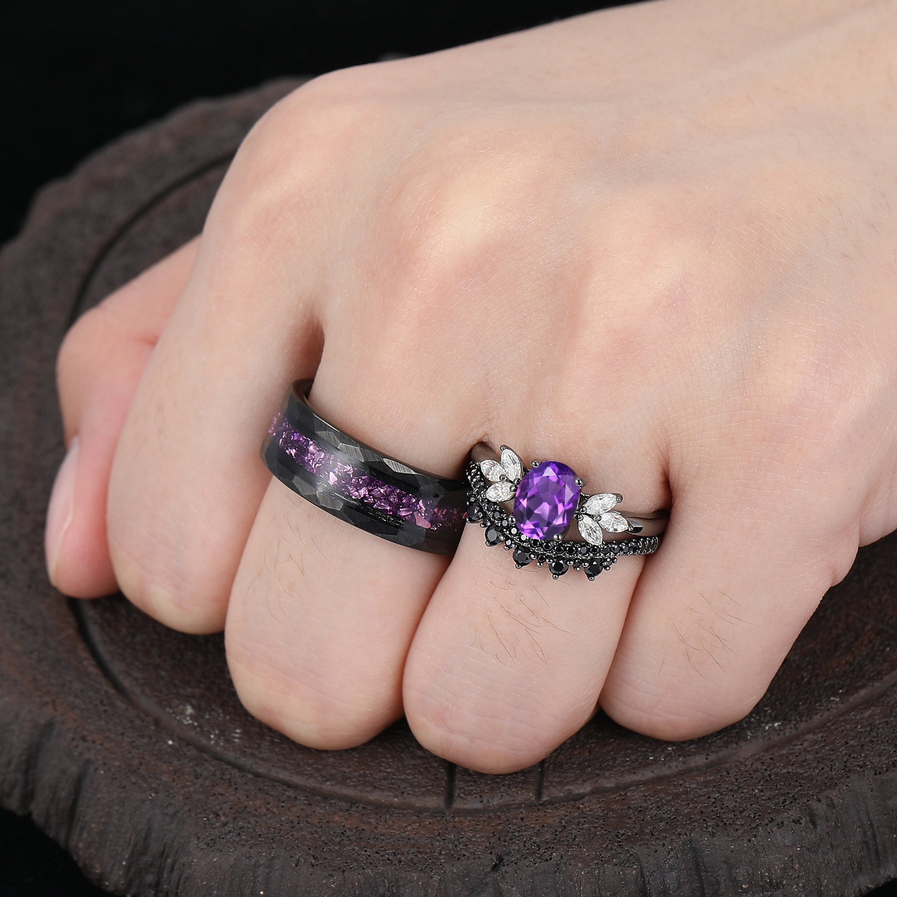 Fijne ringenset voor koppels met natuurlijke amethist en bloembladdetail, zwart geplateerd, bijpassende ringen voor hem en haar