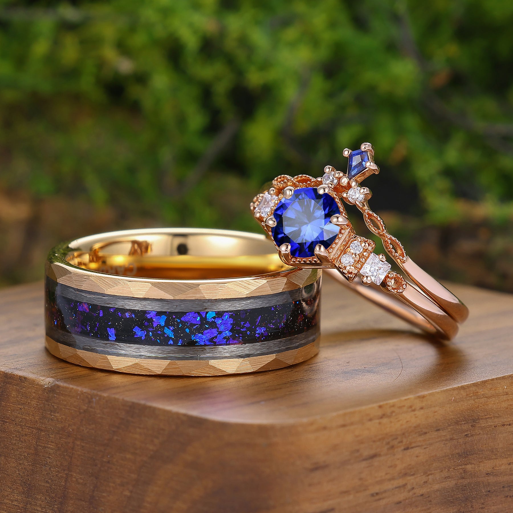 Delicaat ringenset voor koppels met ronde saffier en milgrain, roségoud verguld, bijpassende ringen