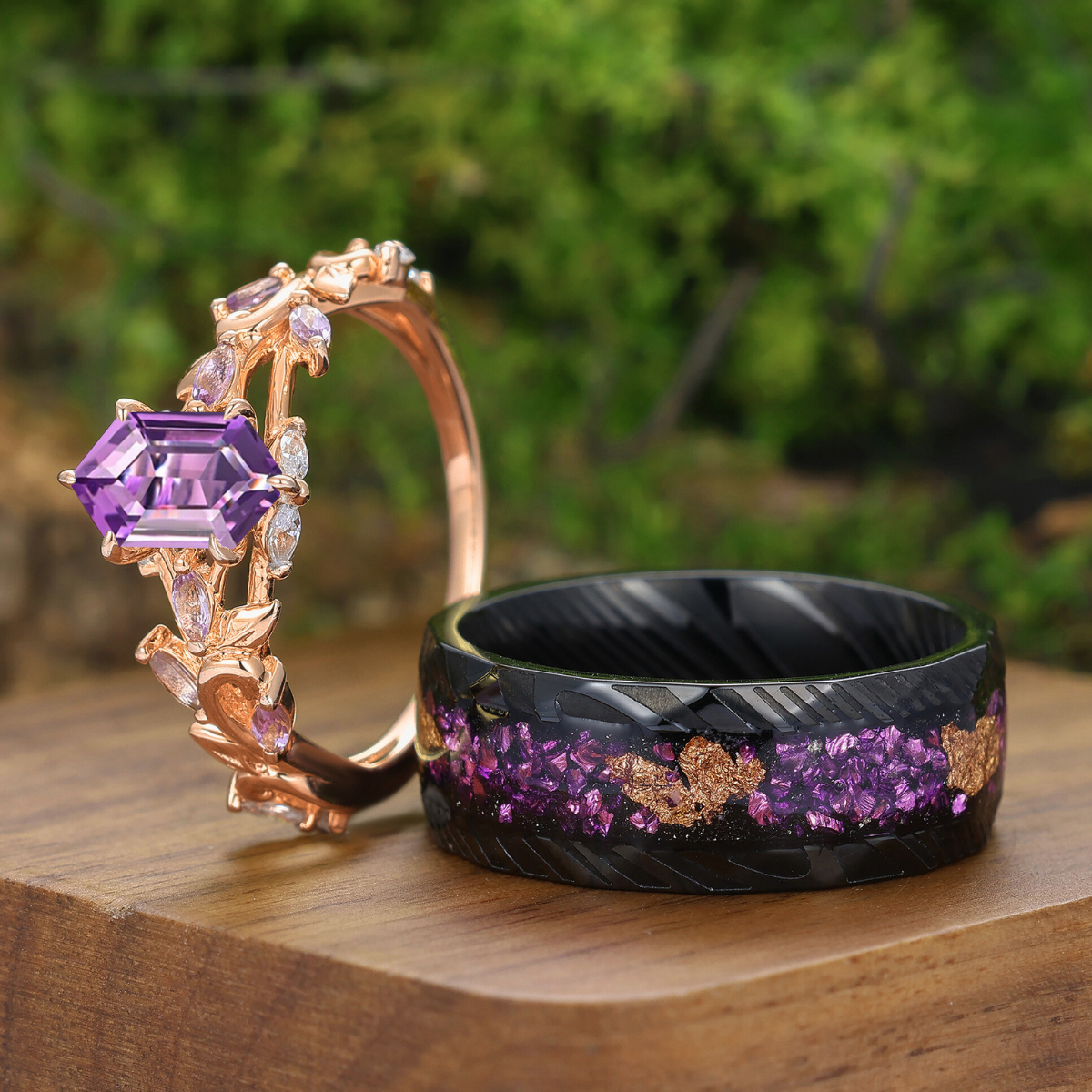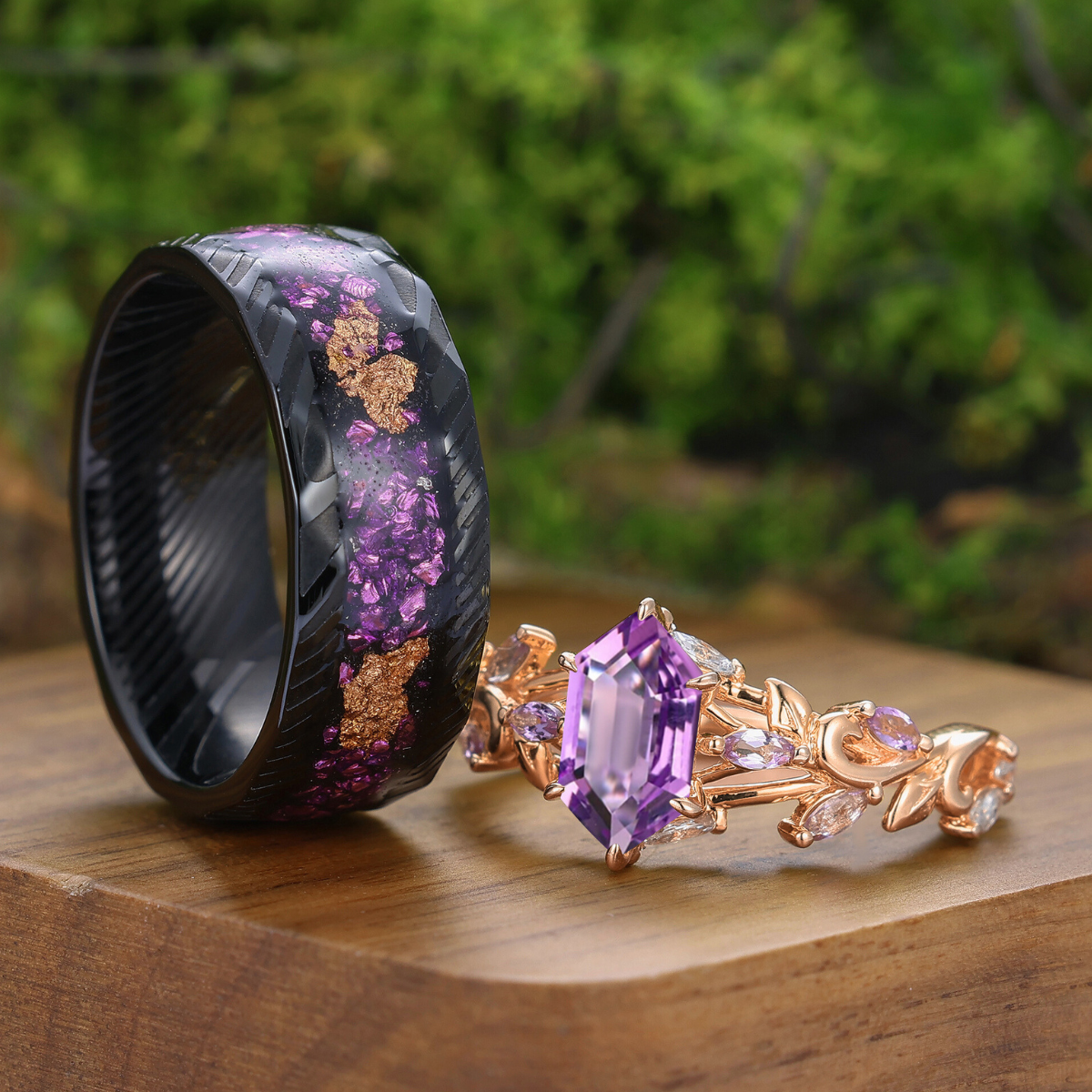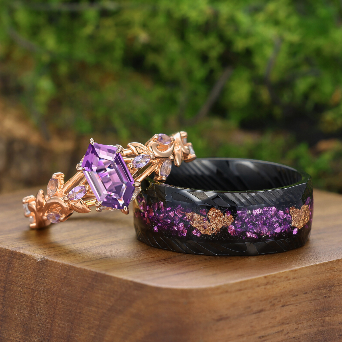 Gekrulde wijnrank ringen met natuurlijke amethist paarse bijpassende ringenset voor hem en haar