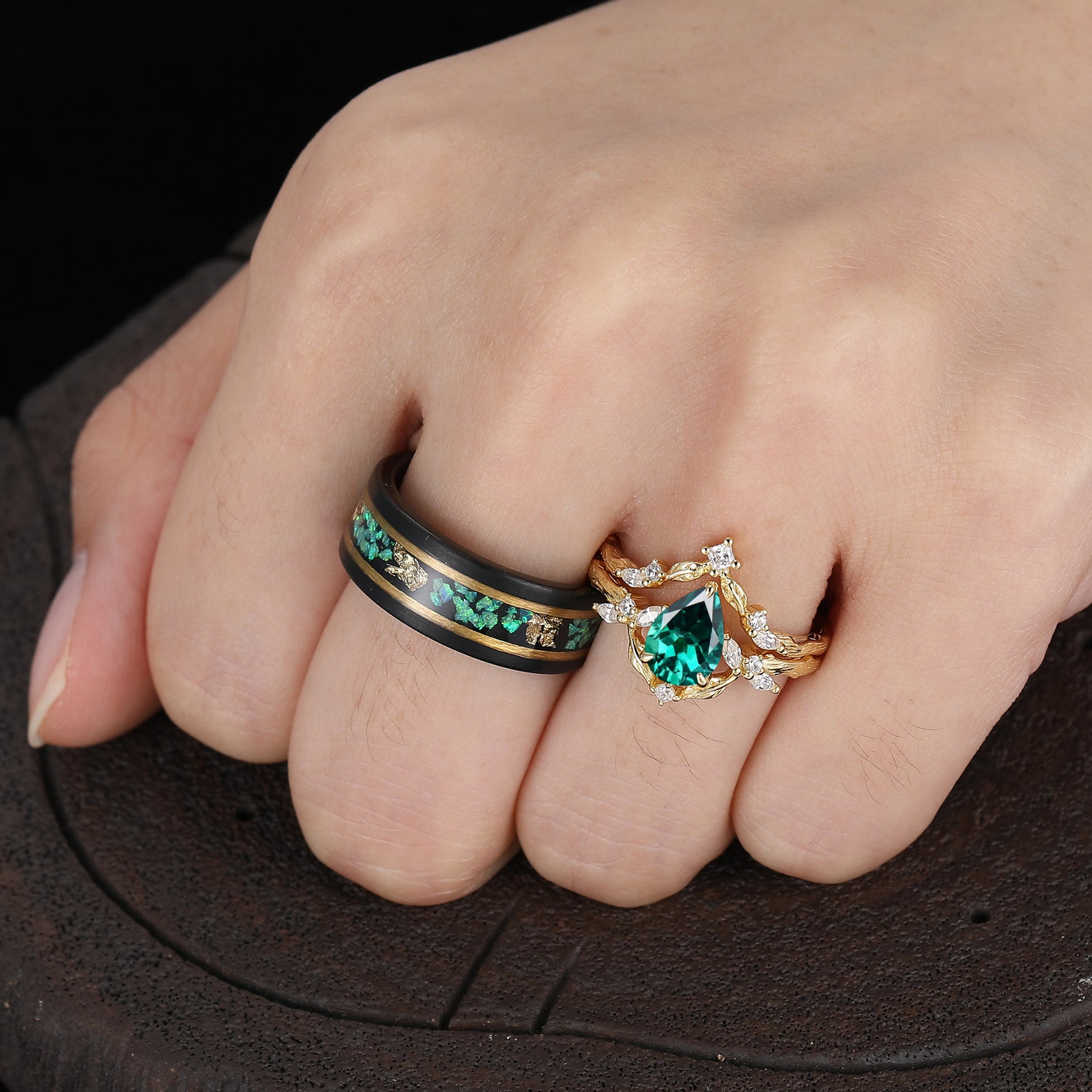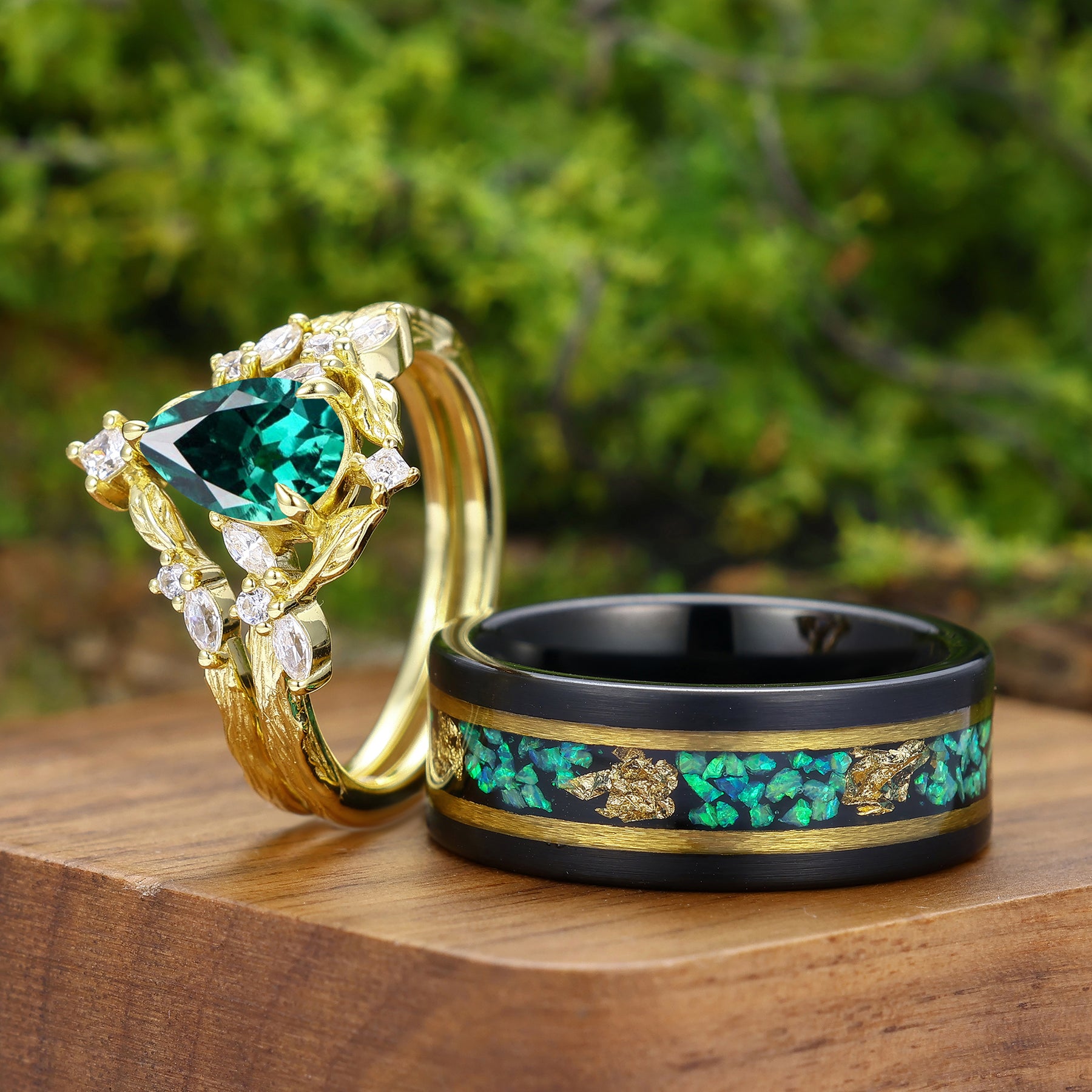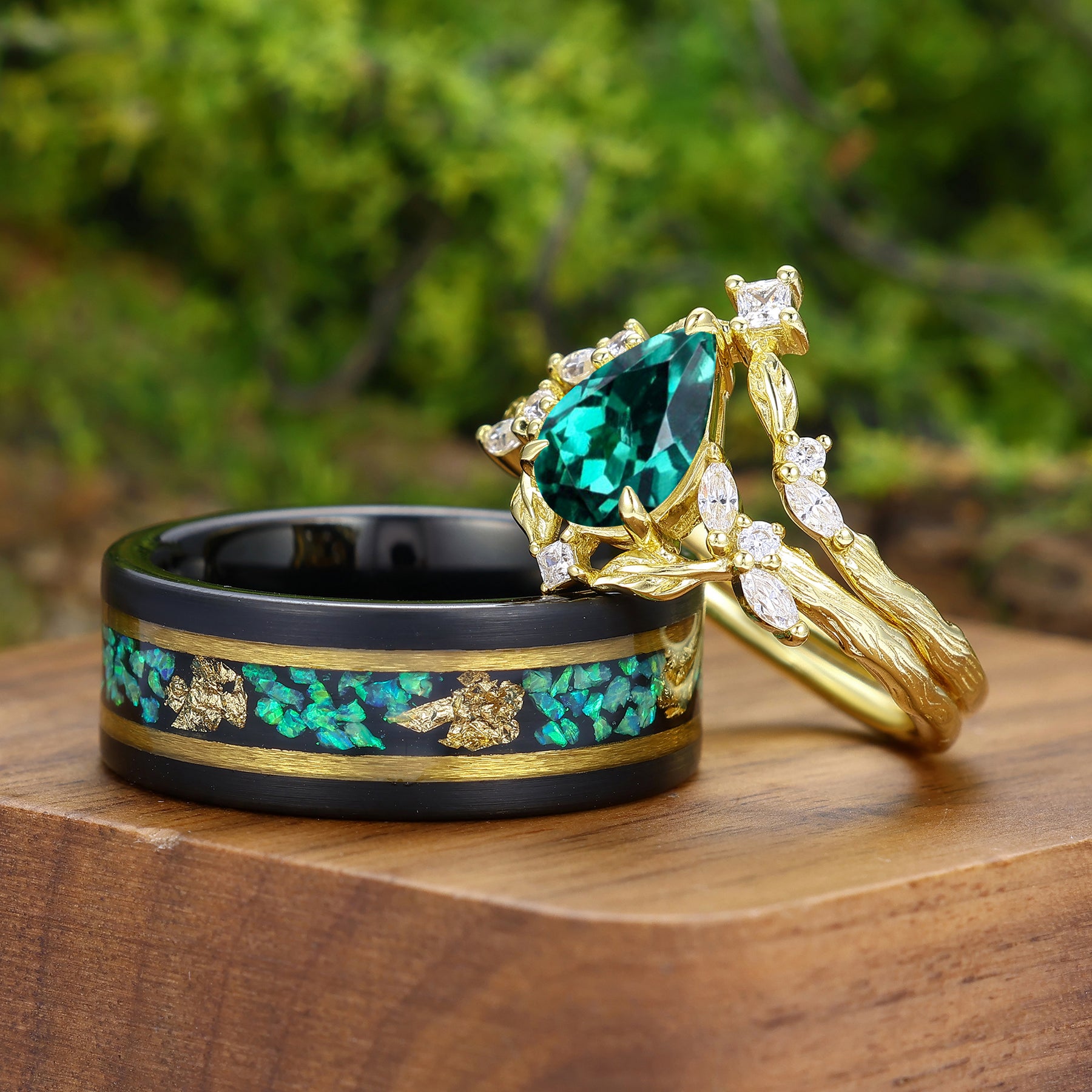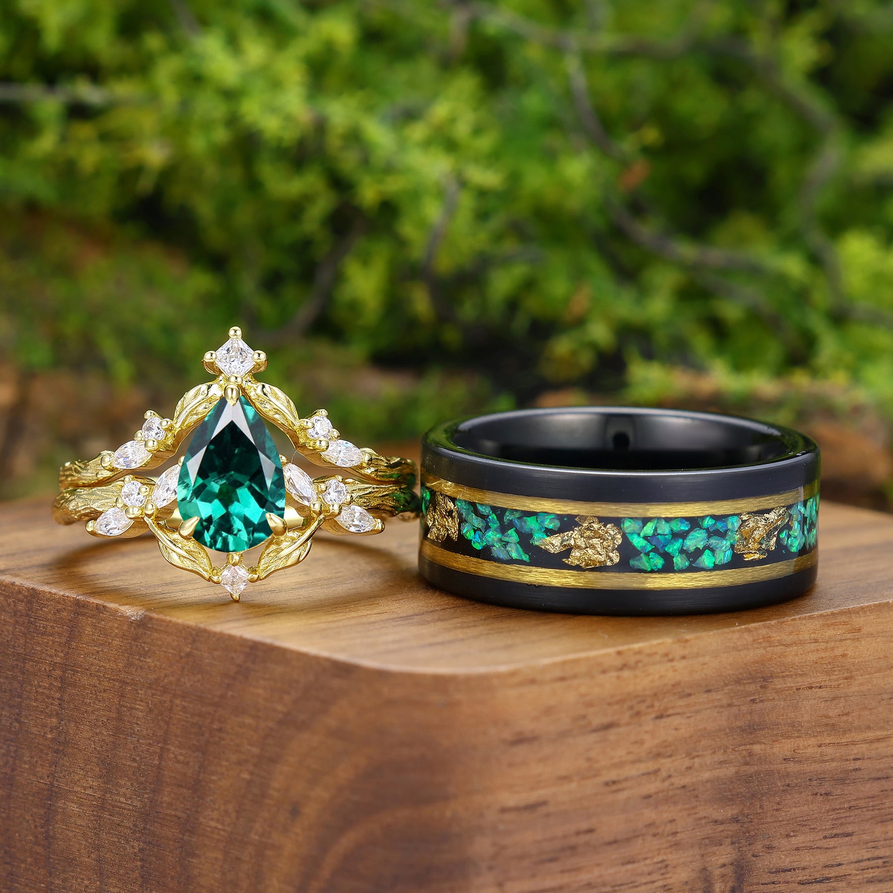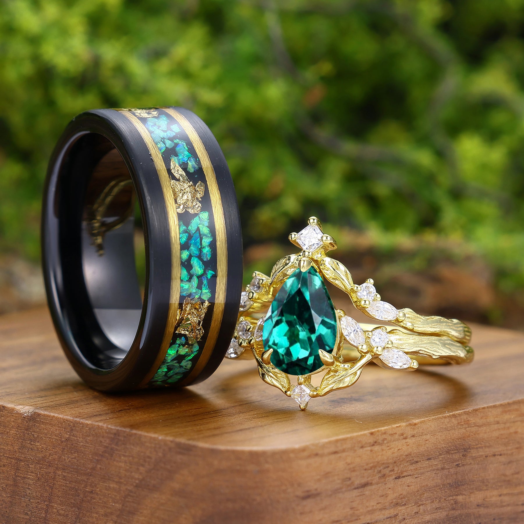 Unieke peervormig geslepen smaragd met takontwerp - set ringen voor koppels, groene smaragden, ringen voor hem en haar
