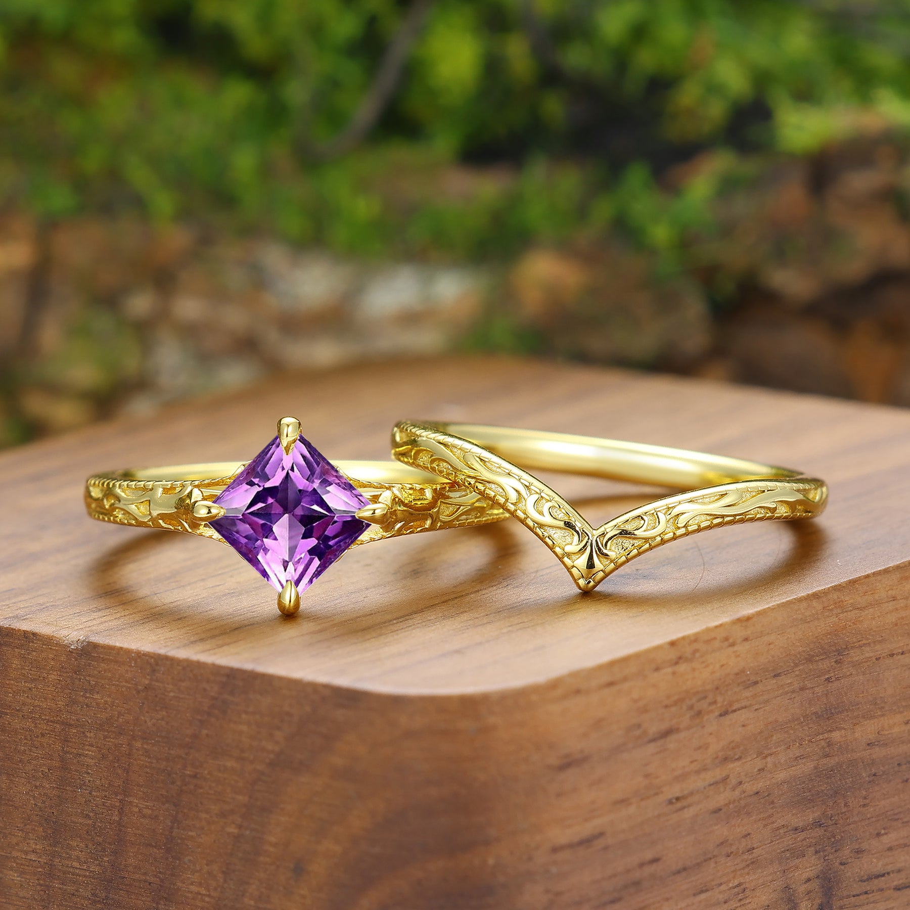 Vintage filigraan gegraveerde vierkante natuurlijke amethist set voor koppels, zijn en haar ringen
