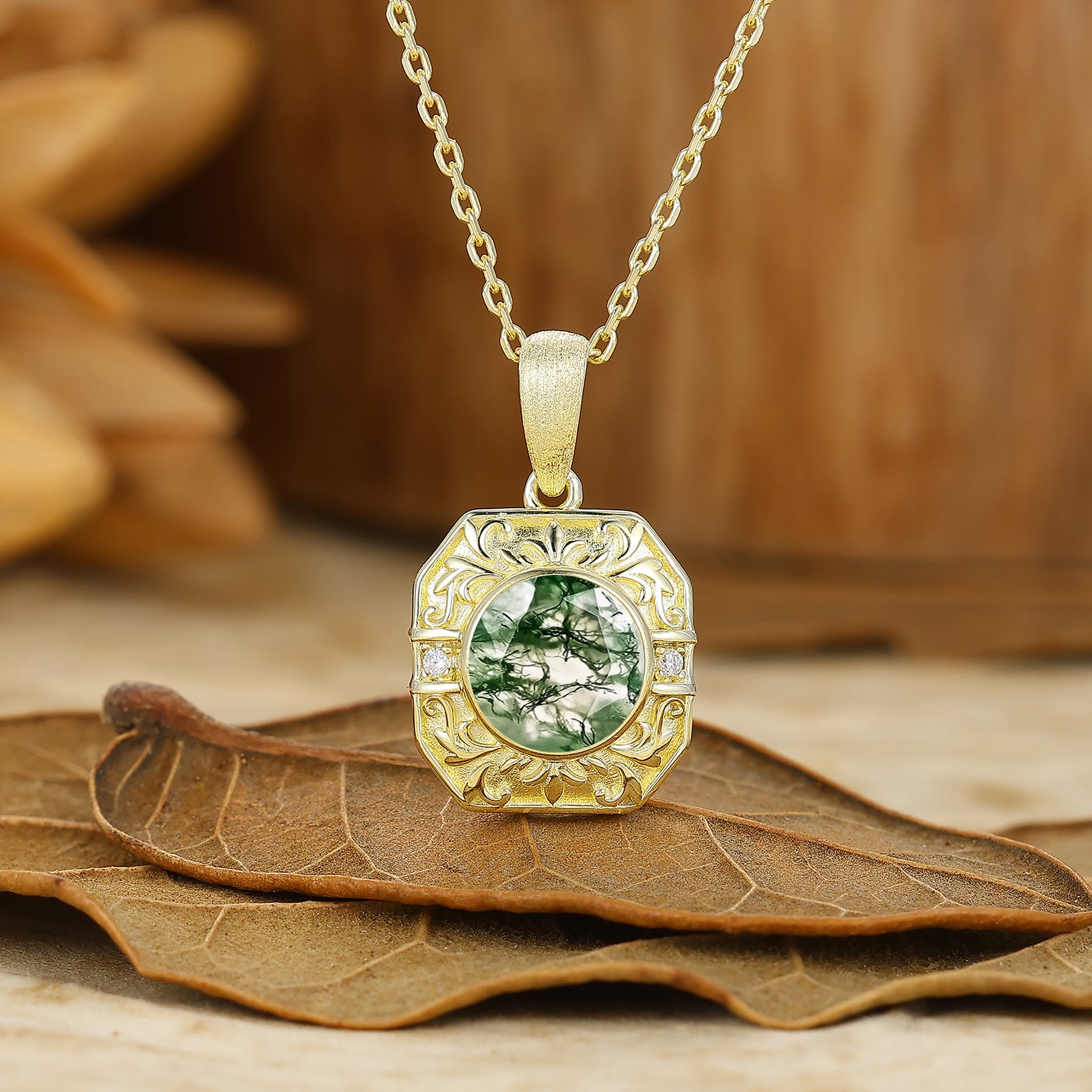 Vintage Style Octagon Filigreed Moss Agate Pendant Solid Rose Gold Women Pendant Necklace