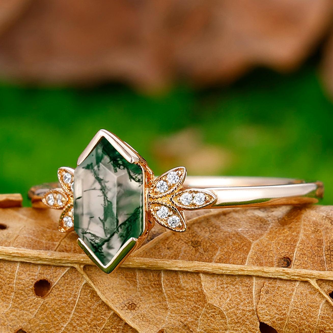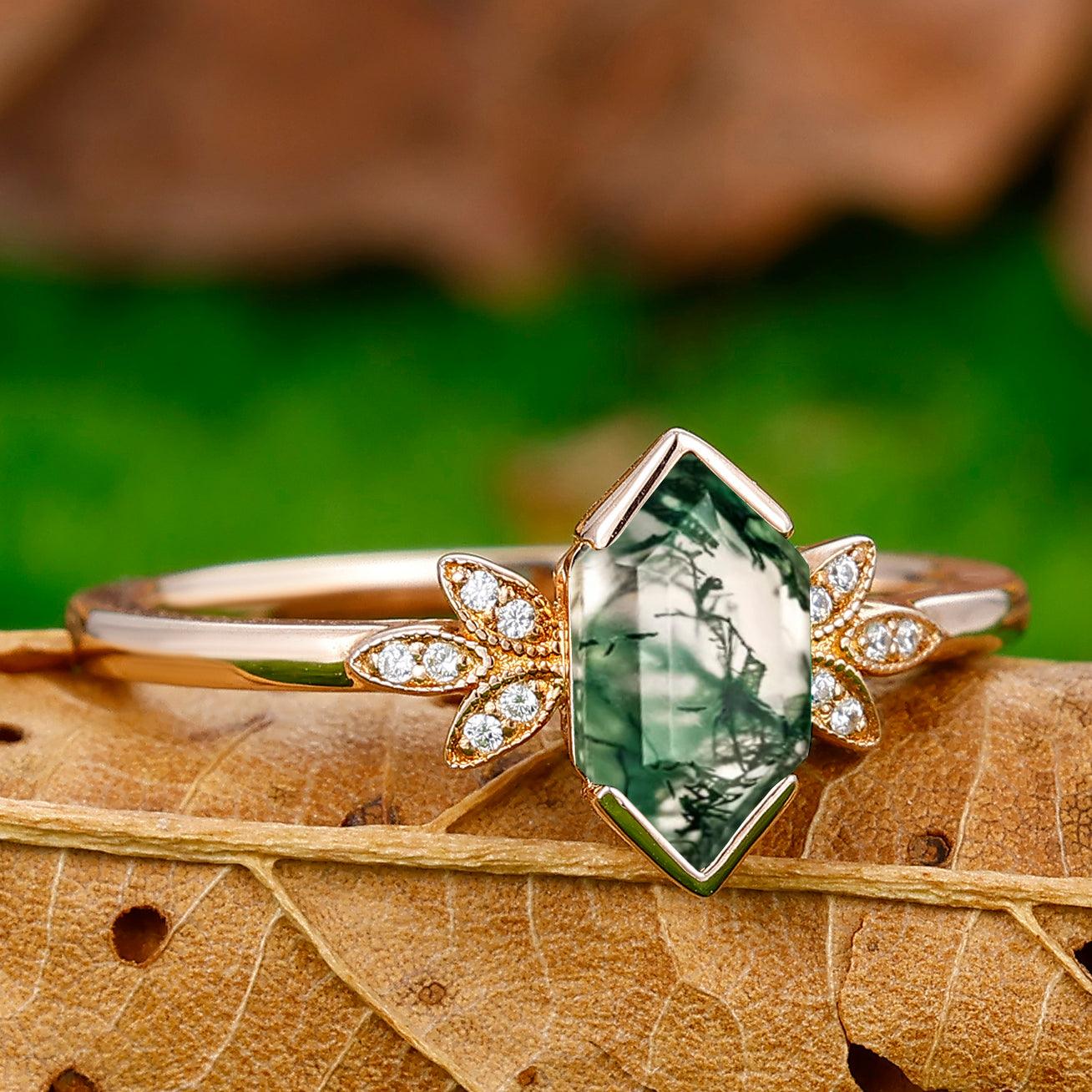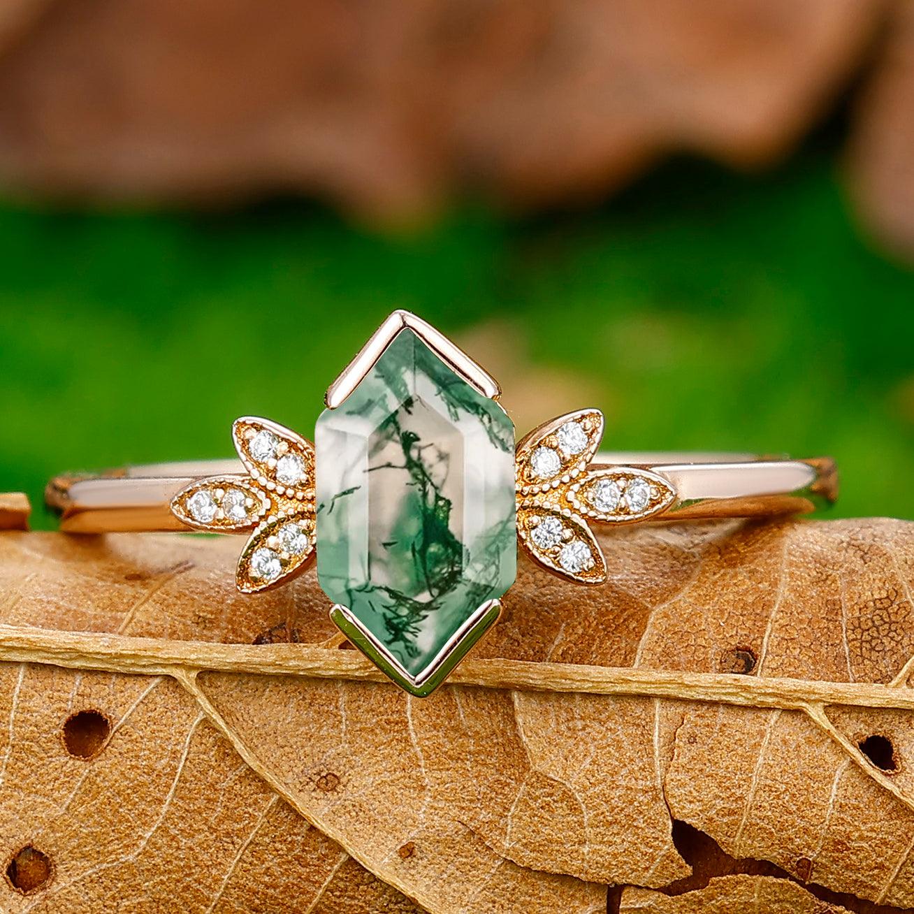 Antique Long Hexagon Cut Moss Agate Floral Ring Vintage Women Promise Ring - Esdomera