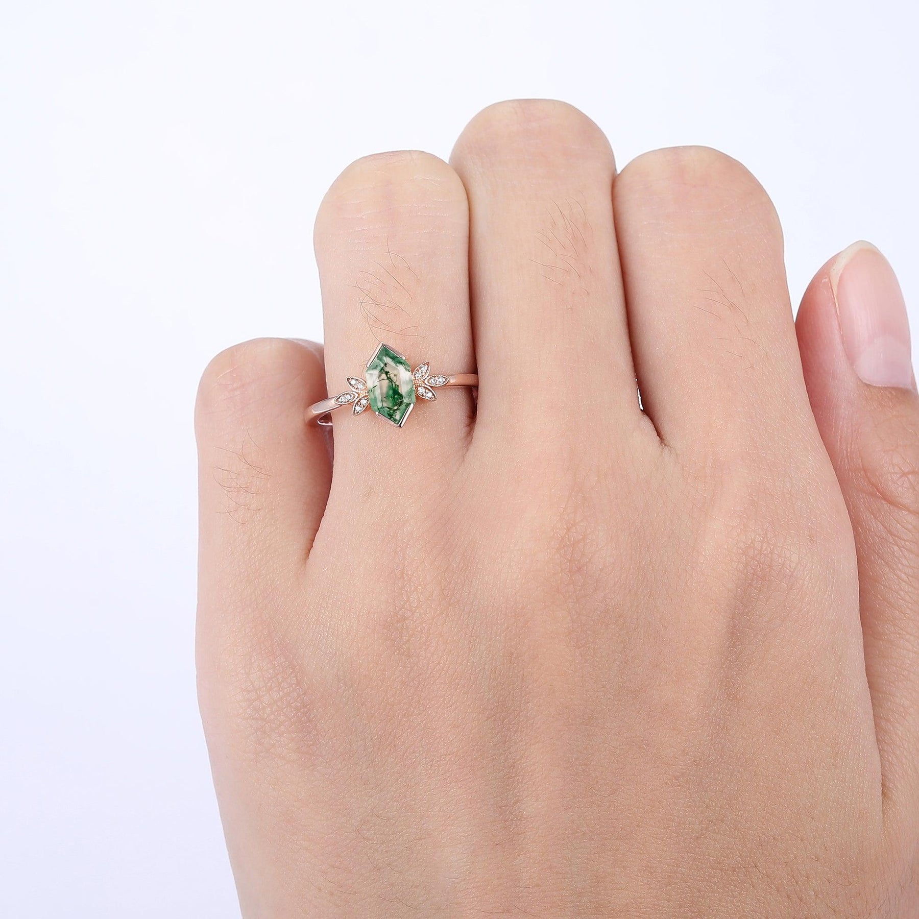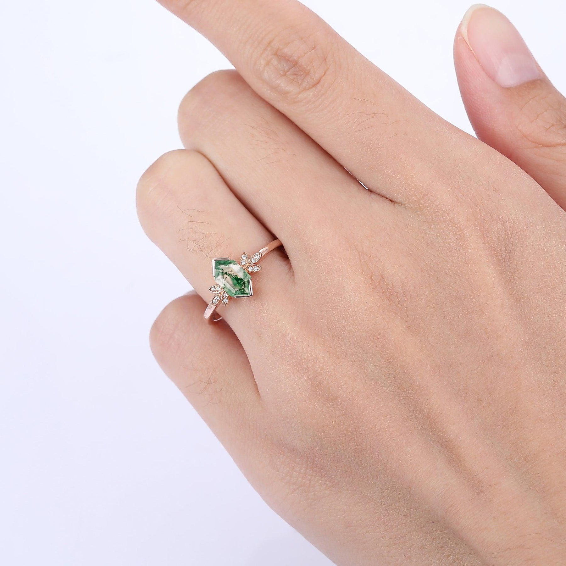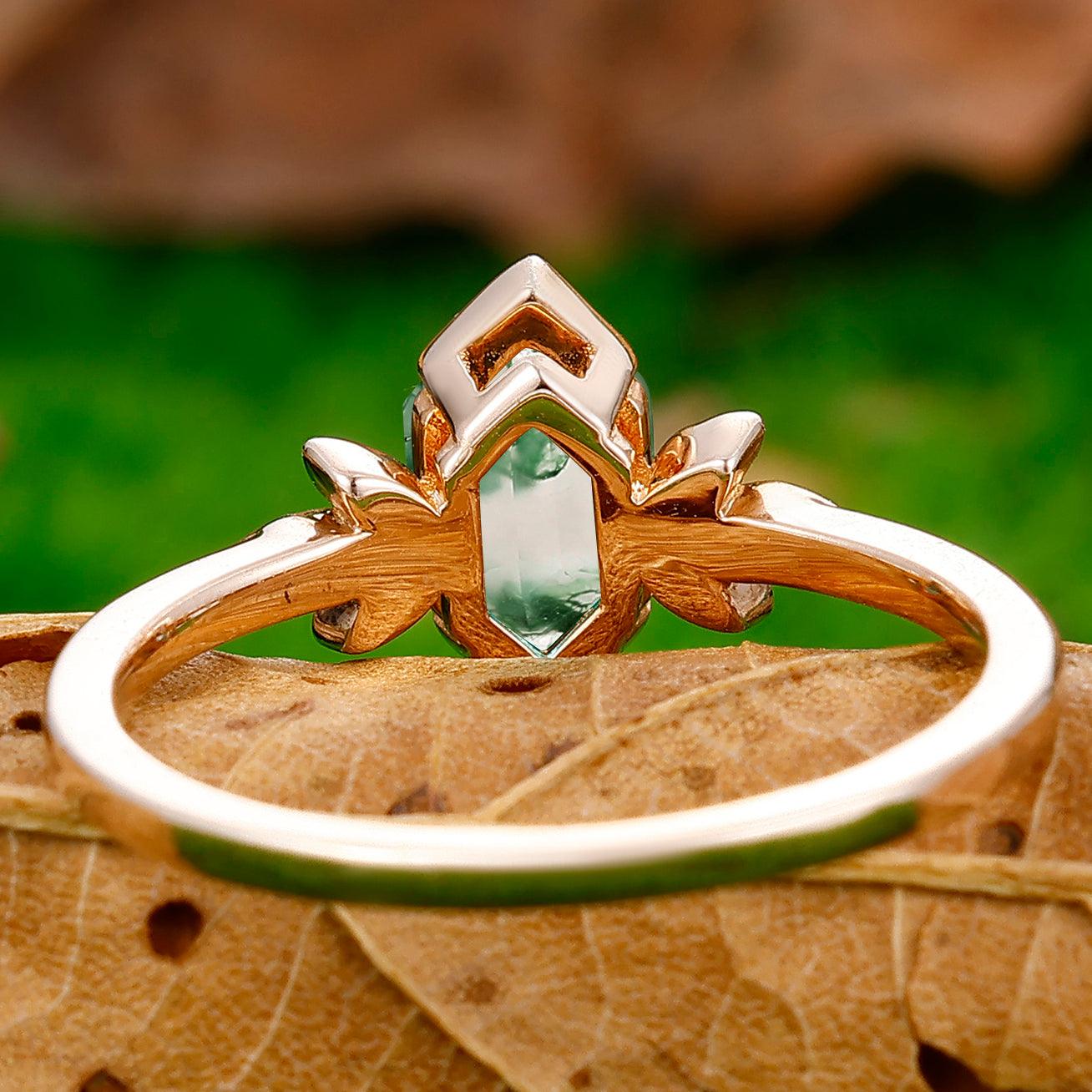 Antique Long Hexagon Cut Moss Agate Floral Ring Vintage Women Promise Ring - Esdomera