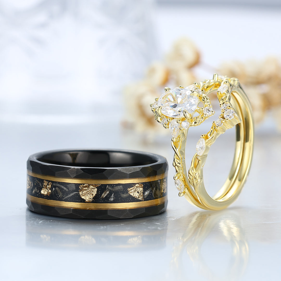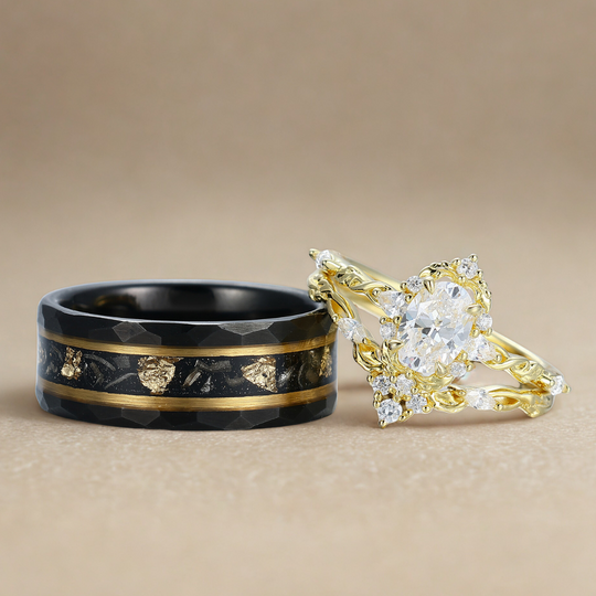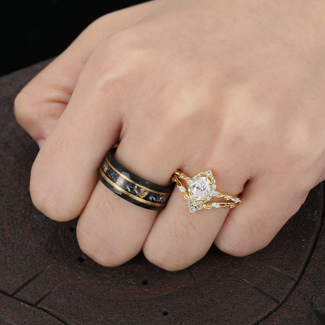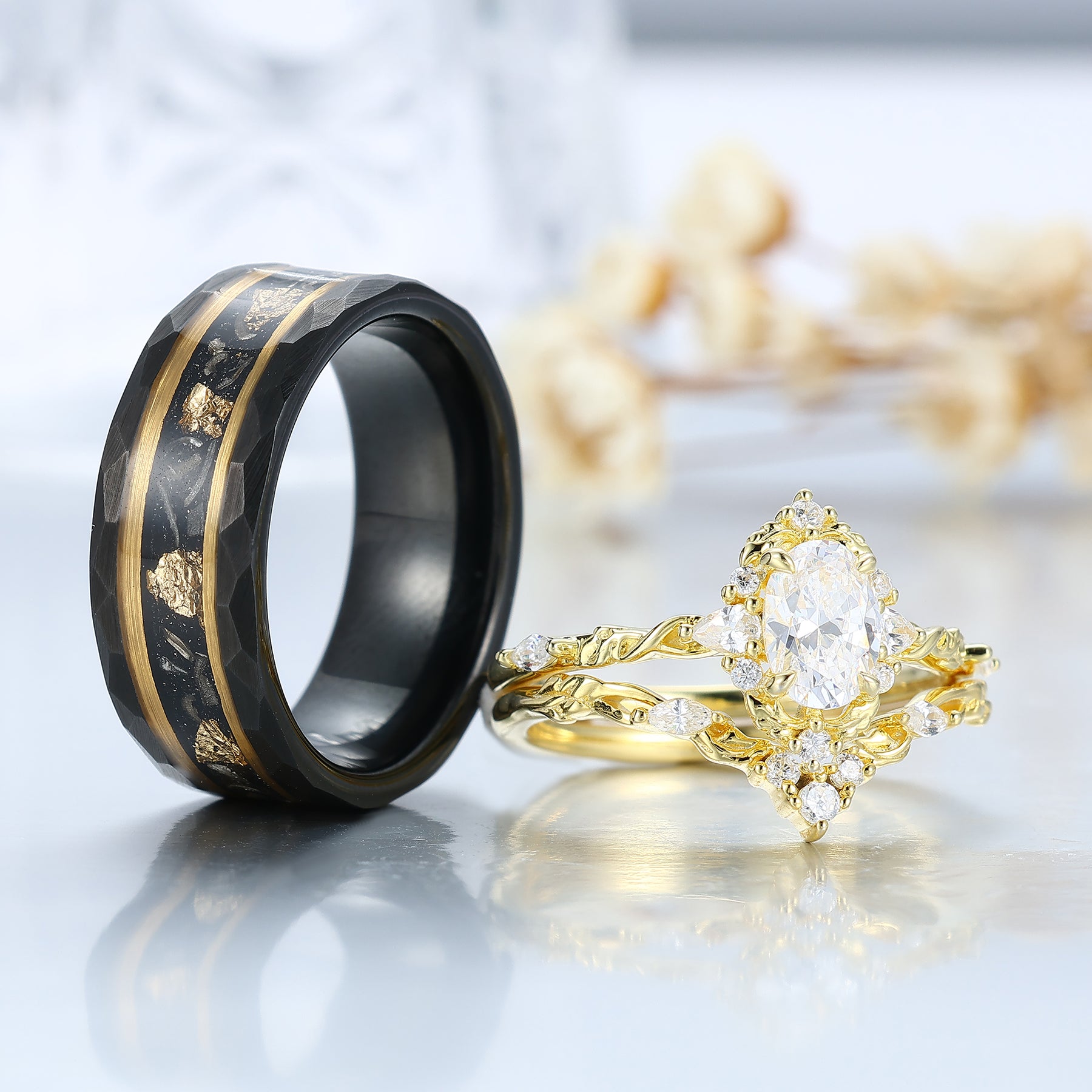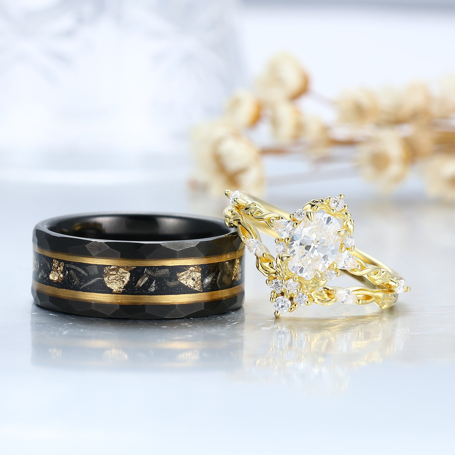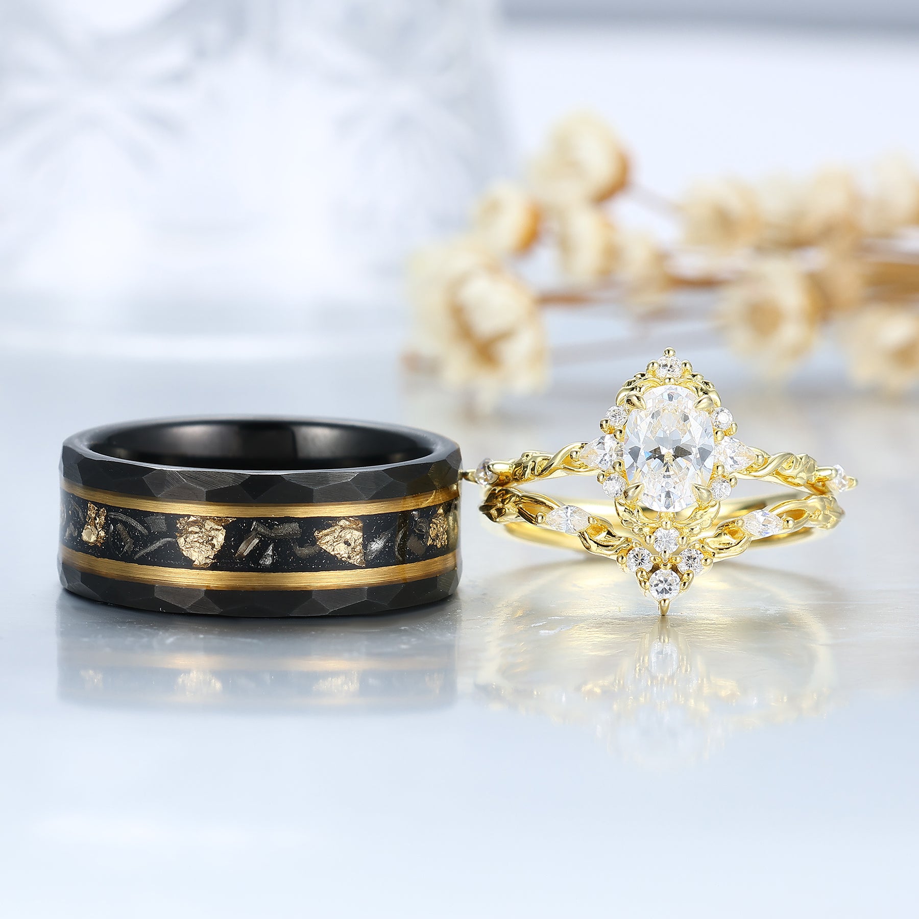 Antique Oval Cut Moissanite Leaf Branch Couple Ring Set Dainty Gold Rings For Him And Her