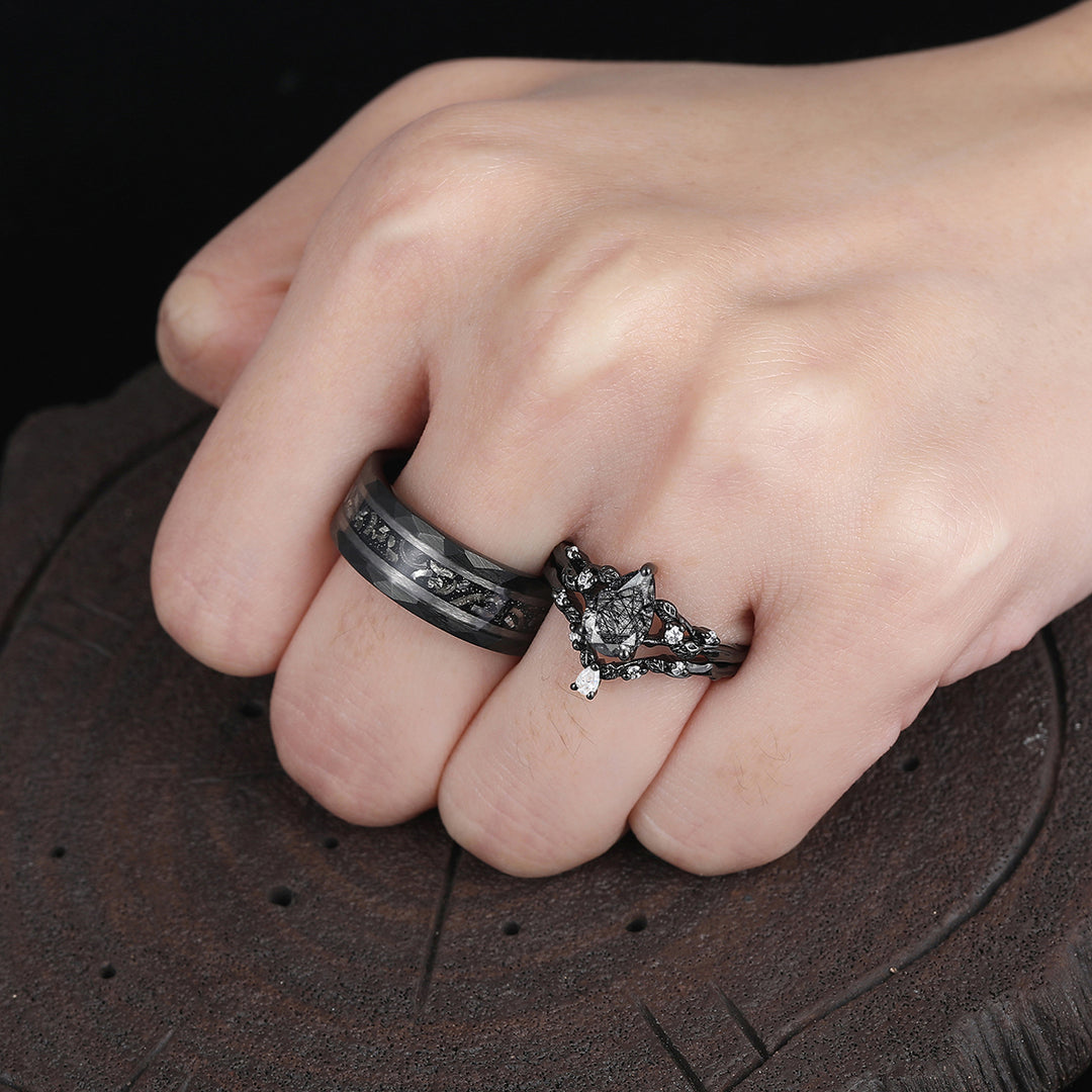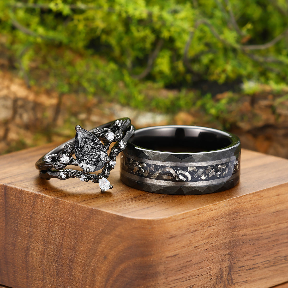 Art Deco Black Rutilated Quartz Branch Design Engagement Couple Rings Set Promise His And Hers Wedding Band