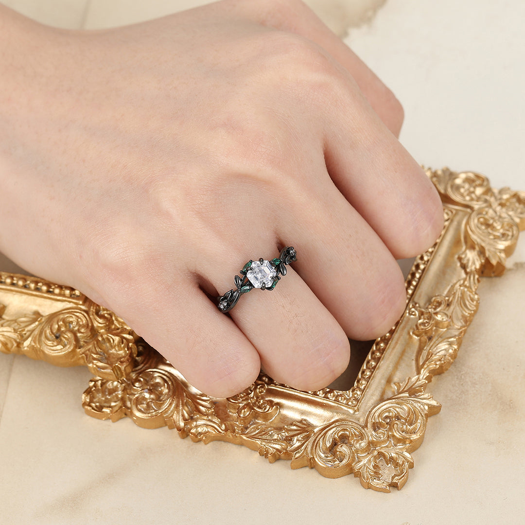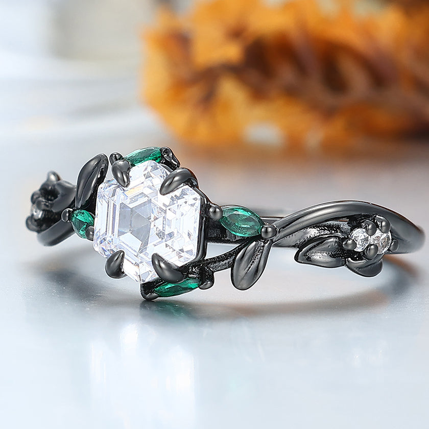 Art Deco Hexagonal Moissanite Twig Engagement Ring Emerald Accents Bridal Ring -  Esdomera.com