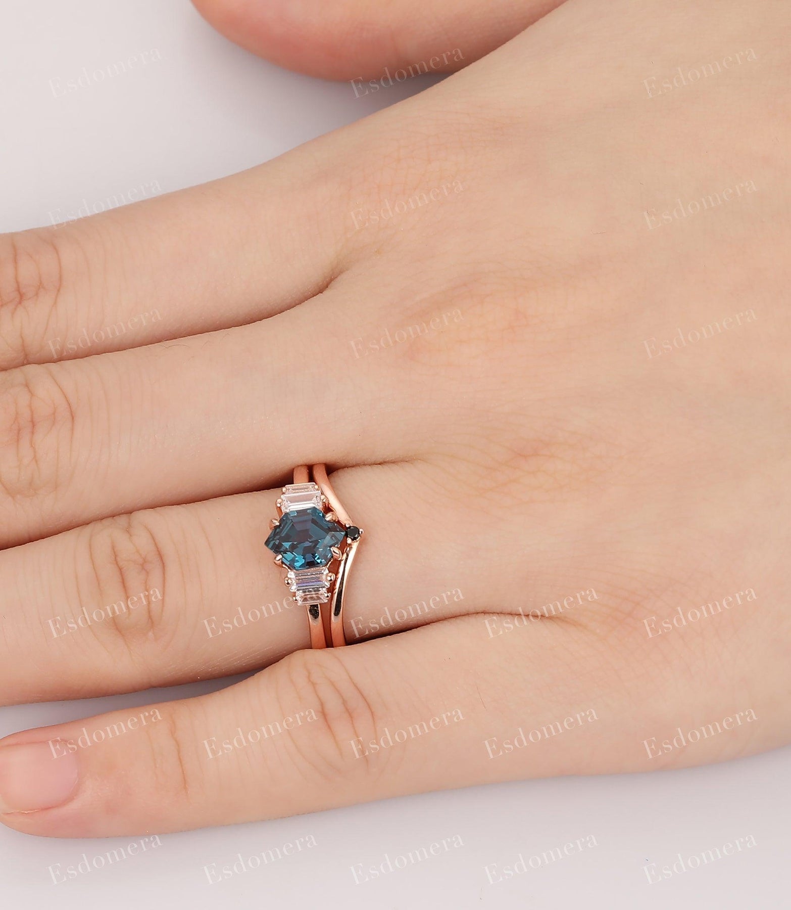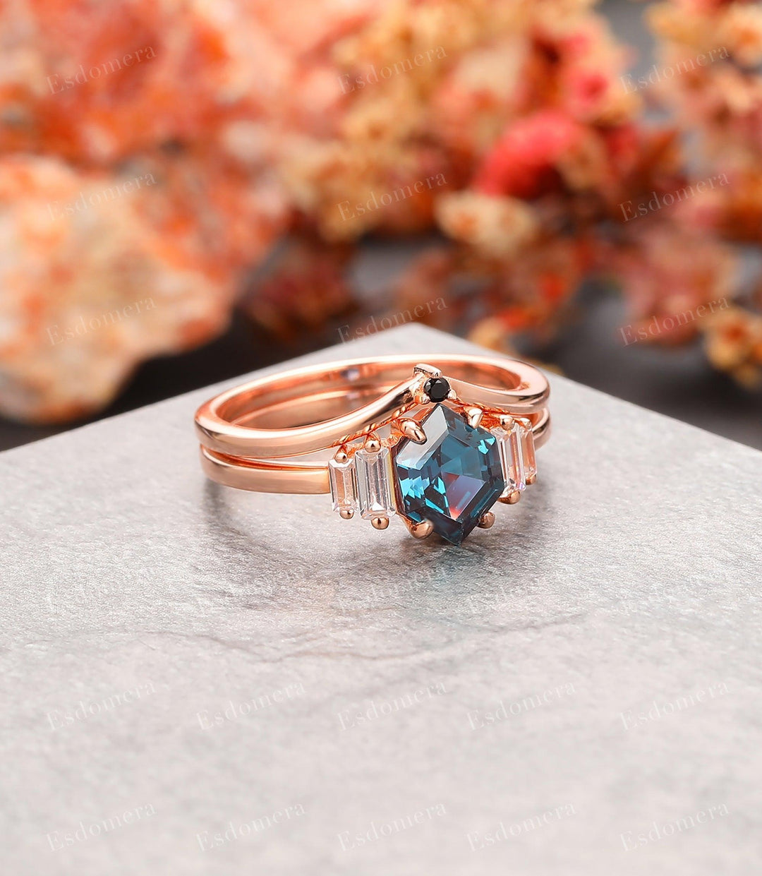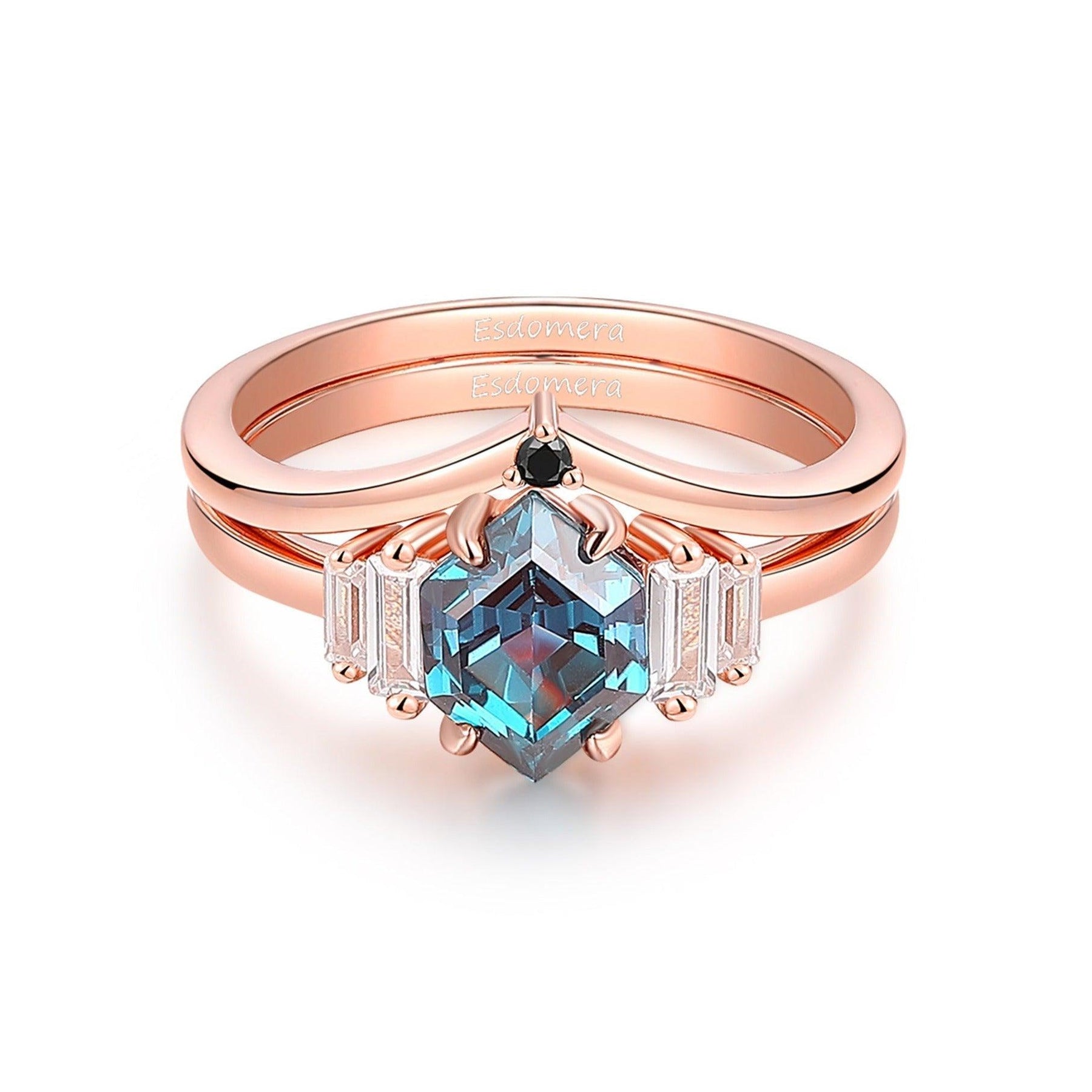 Art Deco Long Hexagon Cut 6x8mm Alexandrite Bridal Sets, Moissanites Accents Engagement Ring Set, Black Spinel Curved Band Stackable Ring - Esdomera