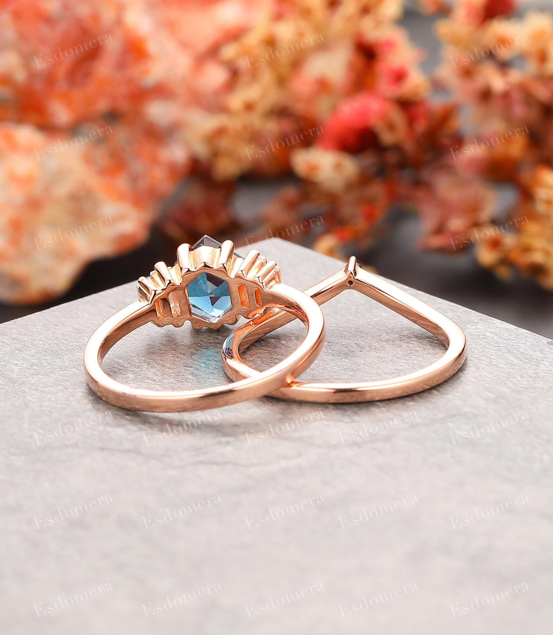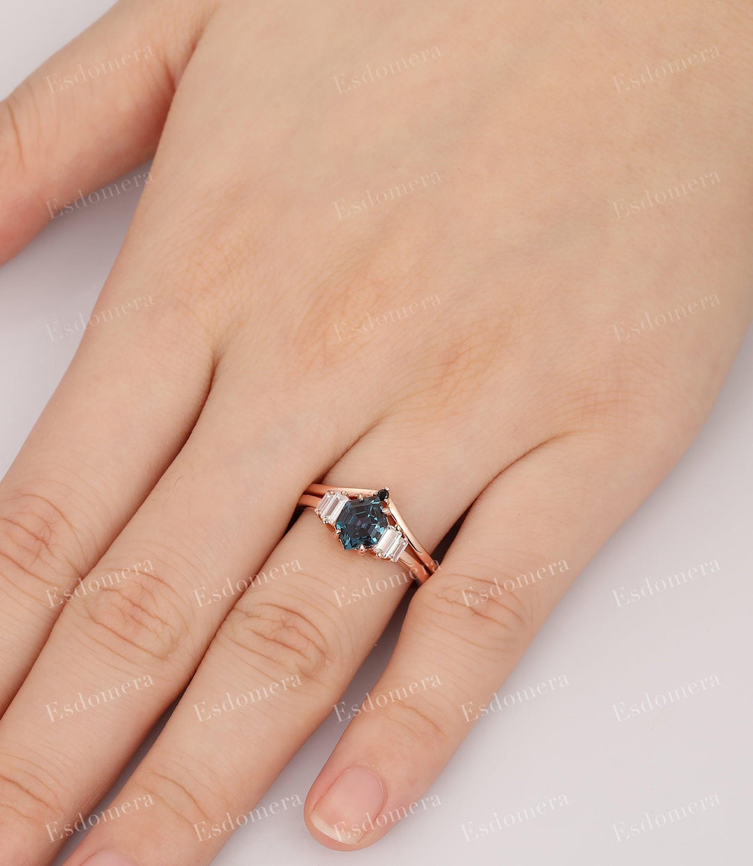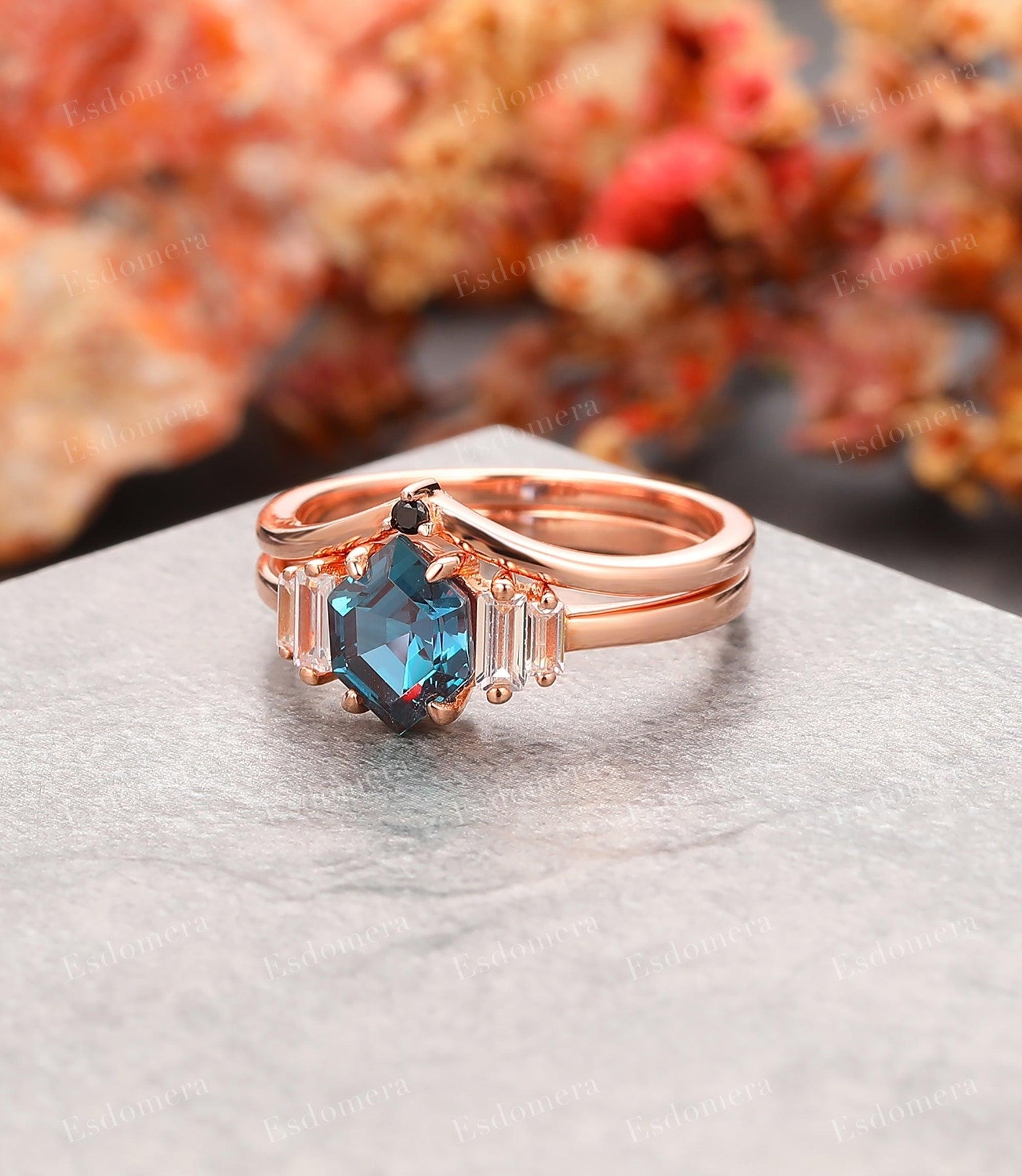 Art Deco Long Hexagon Cut 6x8mm Alexandrite Bridal Sets, Moissanites Accents Engagement Ring Set, Black Spinel Curved Band Stackable Ring - Esdomera