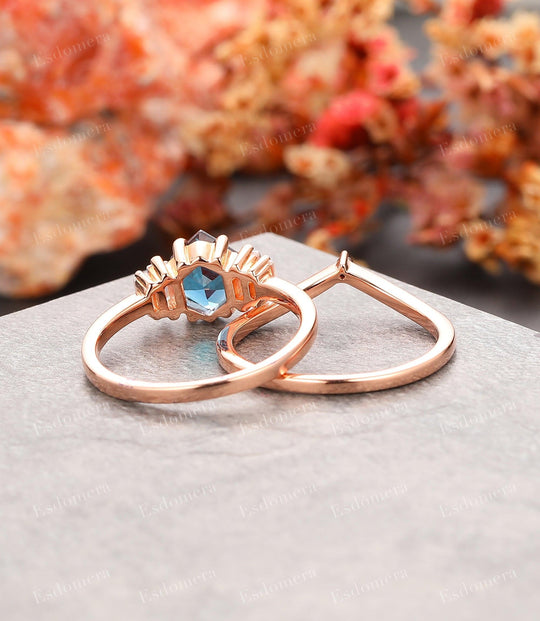 Art Deco Long Hexagon Cut 6x8mm Alexandrite Bridal Sets, Moissanites Accents Engagement Ring Set, Black Spinel Curved Band Stackable Ring