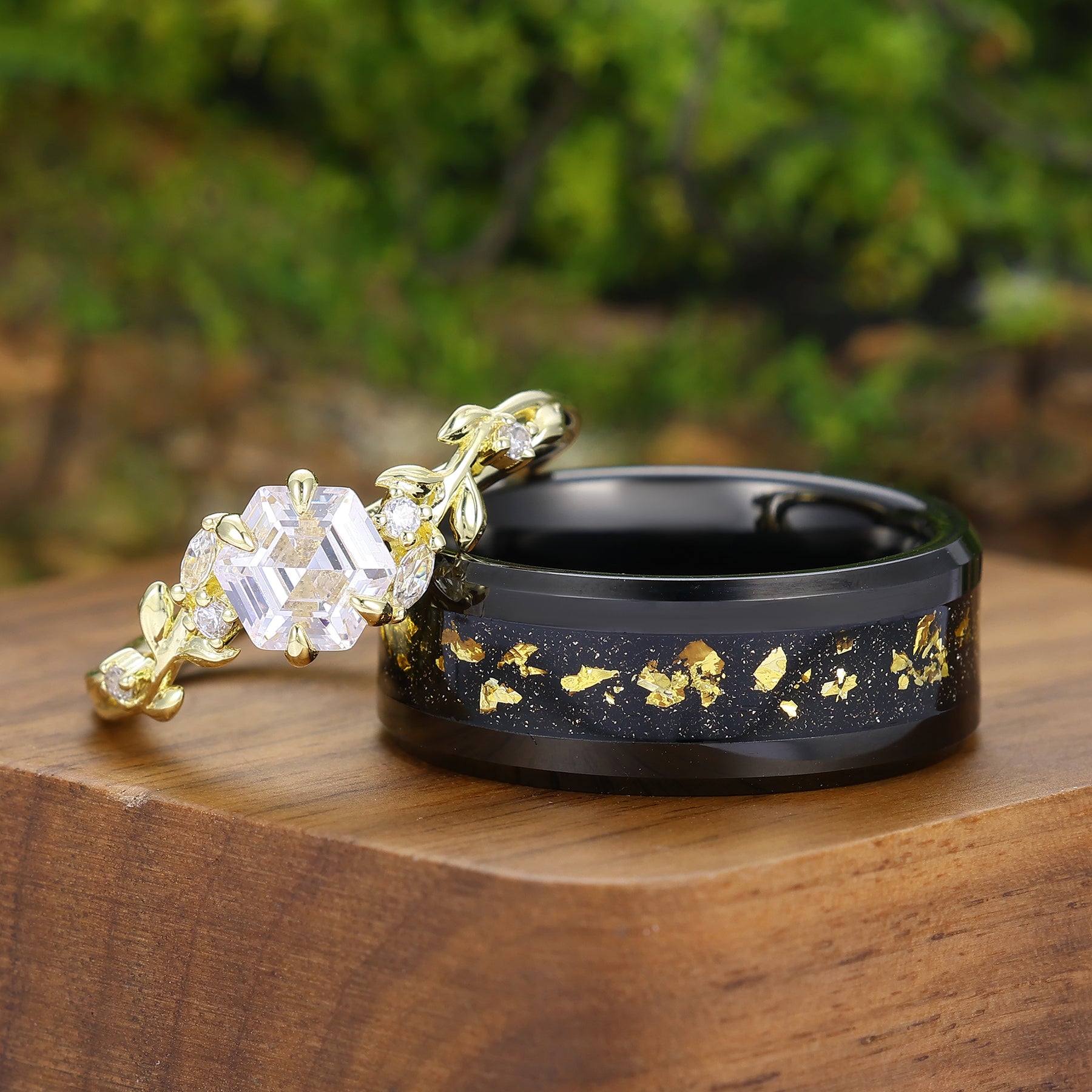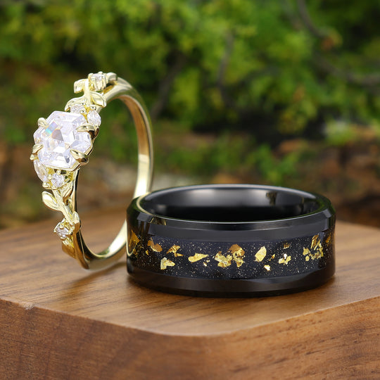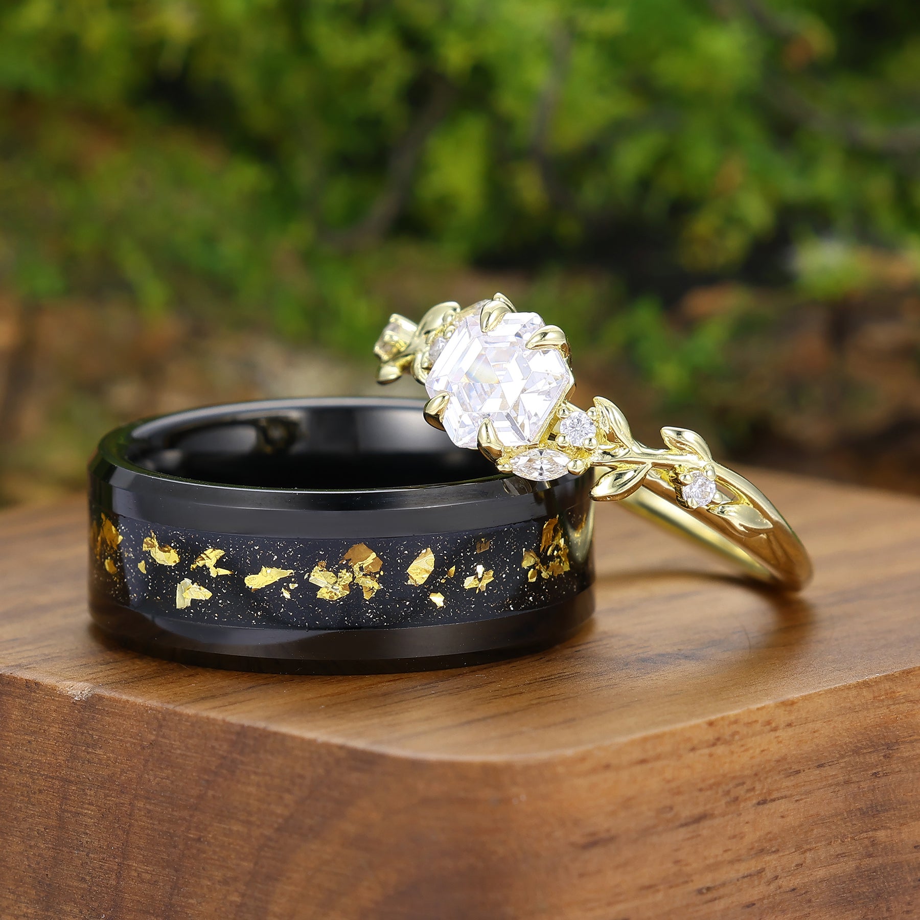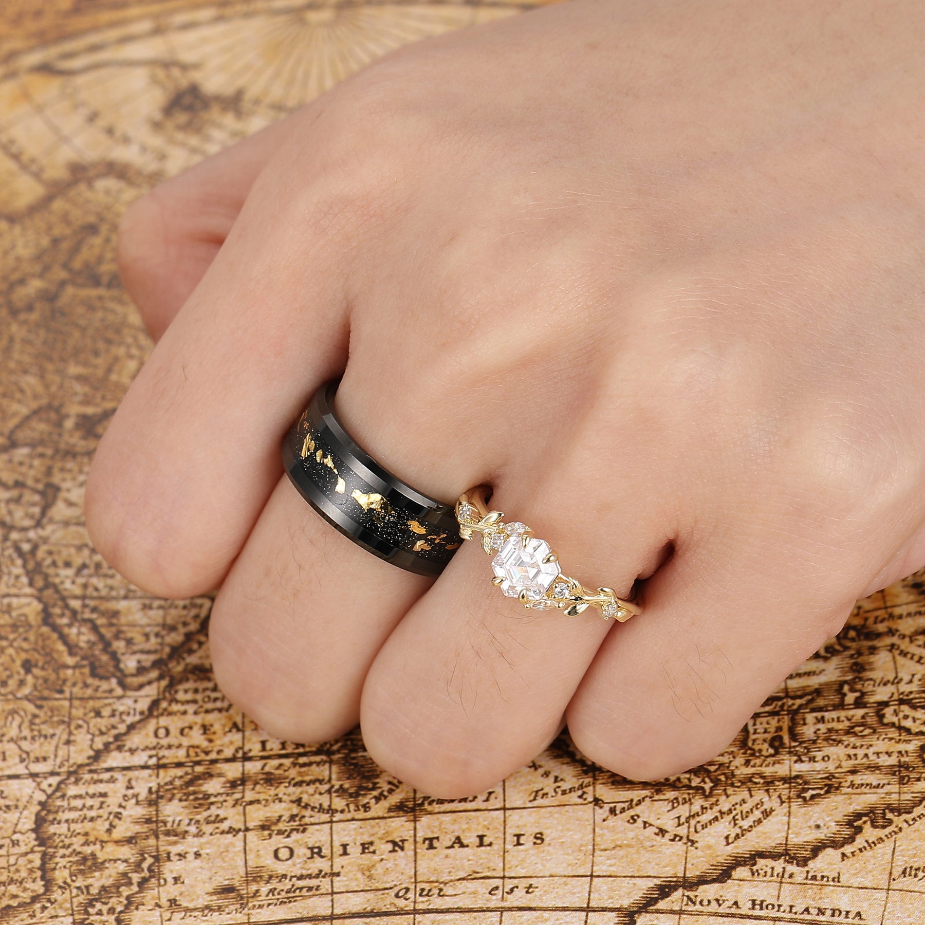 Artsy Engraved Leaf Moissanite Couple Rings Matching Rings Set For Men For Women