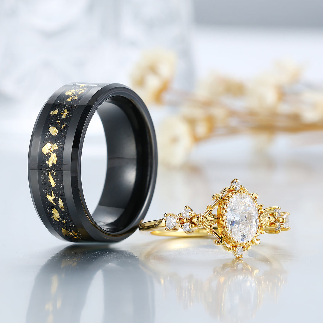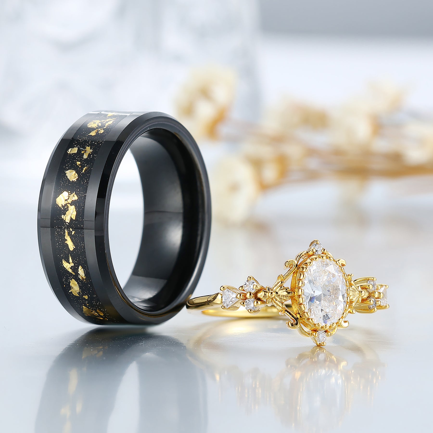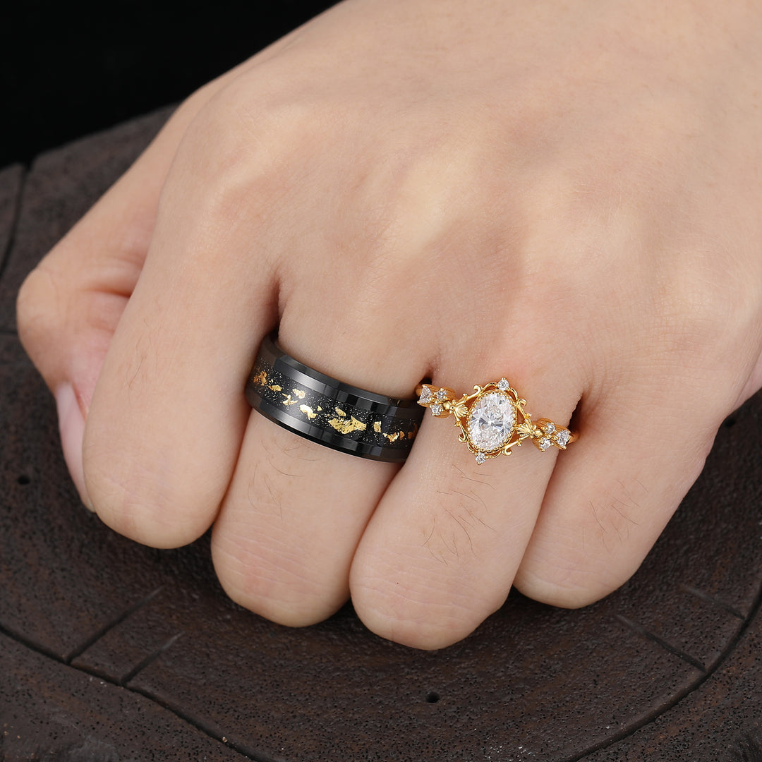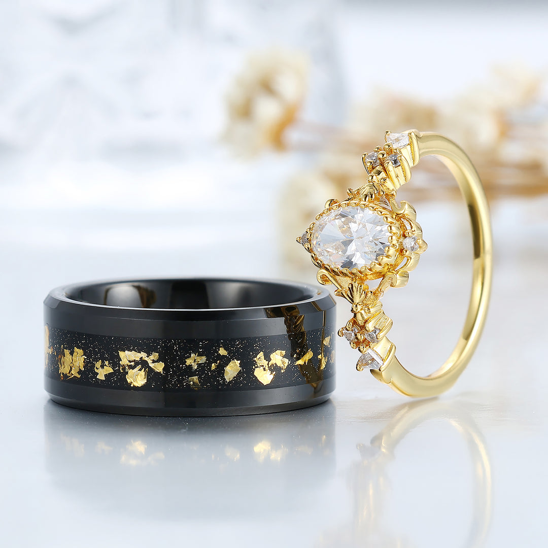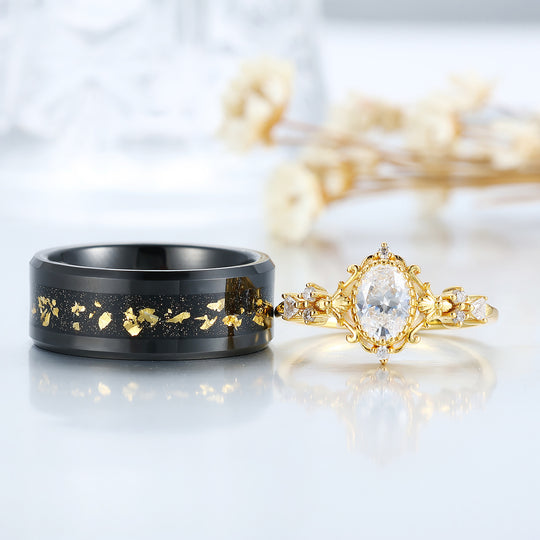 Baroque-inspired Oval Moissanite Couples Ring Dainty Yellow Gold His And Hers Matching Rings