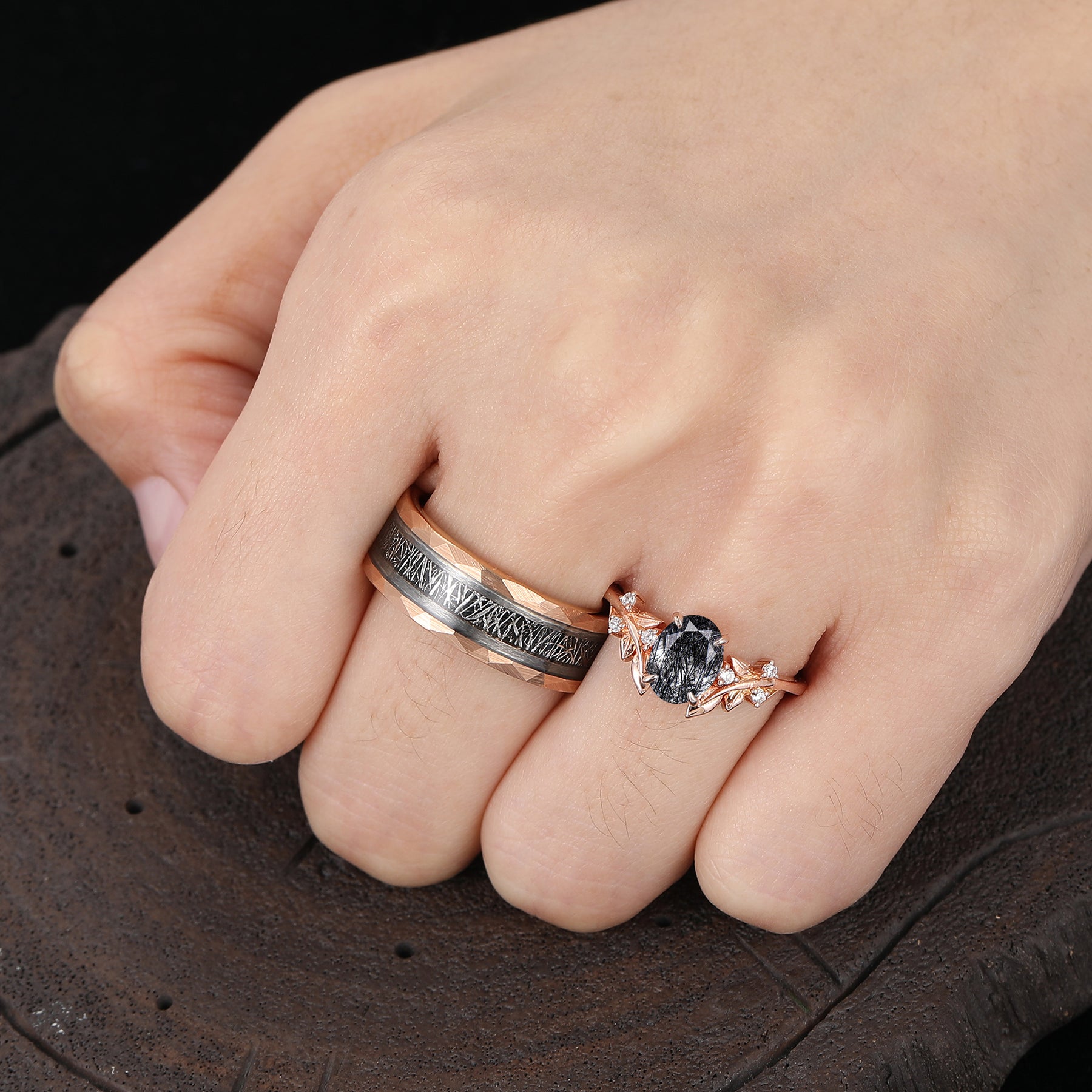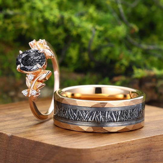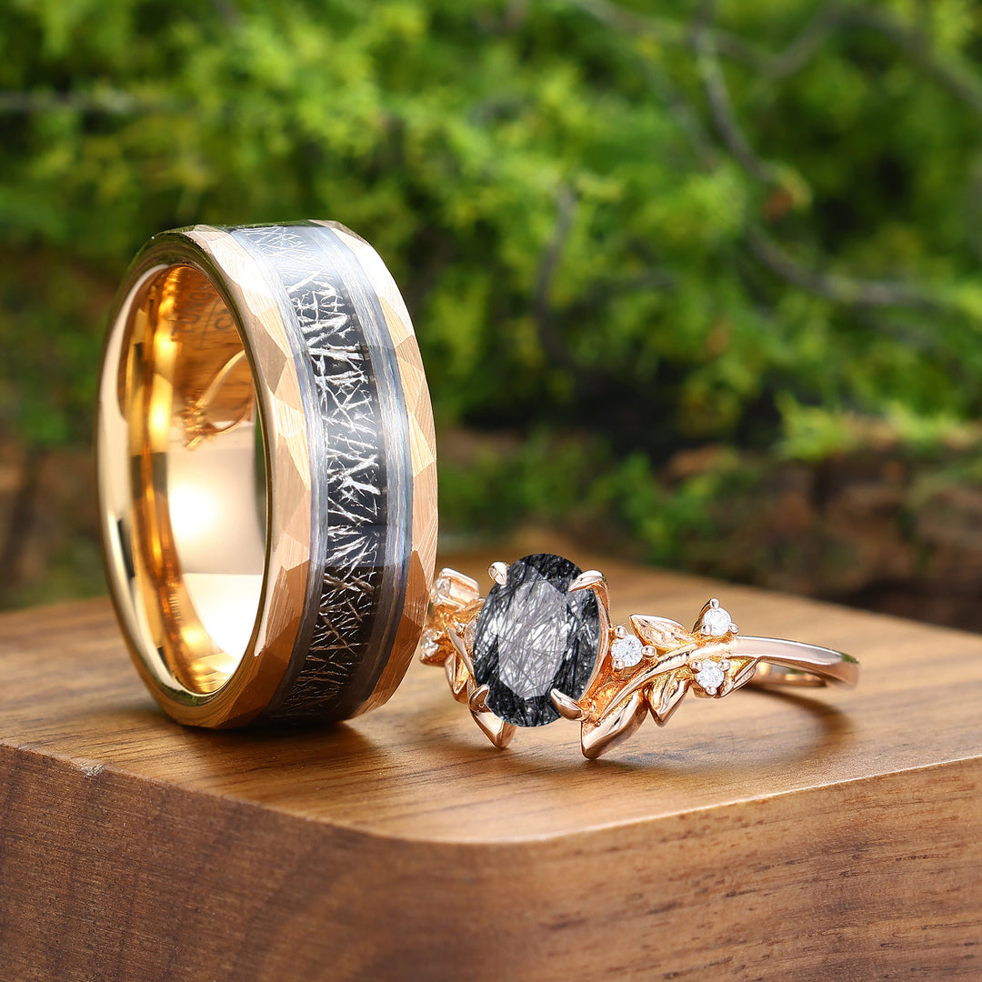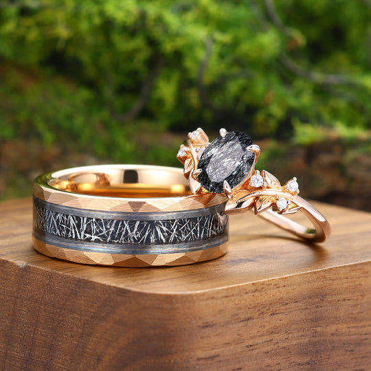 Black Rutilated Quartz Leaf Vine Couples Ring Set Matching Band For Men And Women