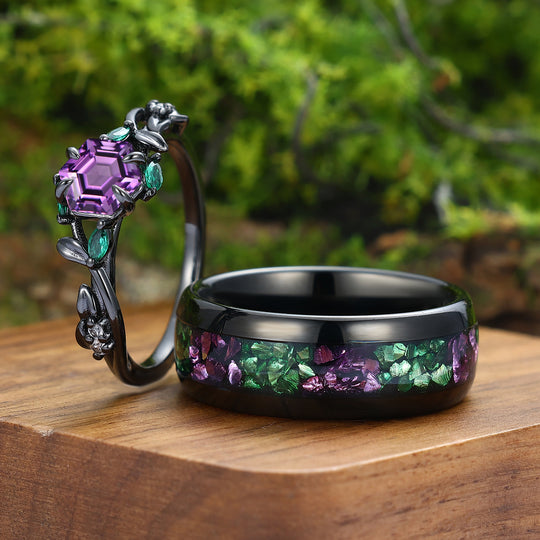 Metal Type: Tungsten Carbide - Amethyst and Lab Grown Emerald Inlay - Hypoallergenic