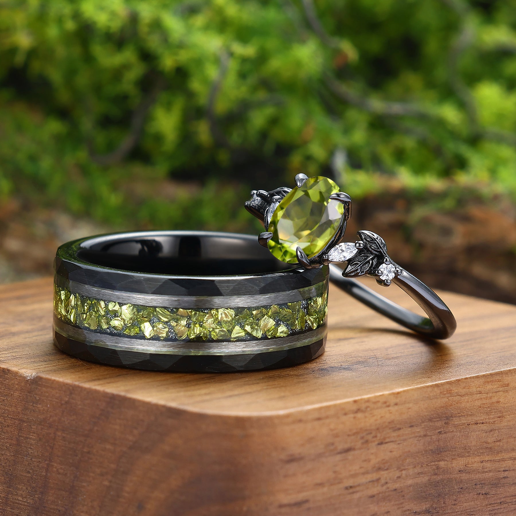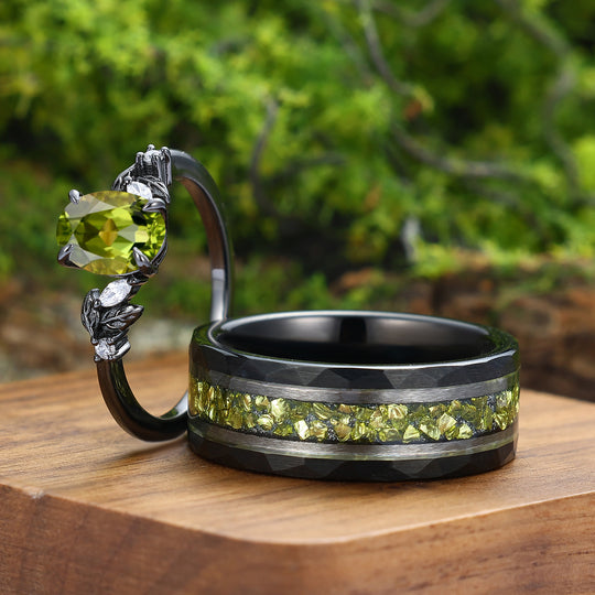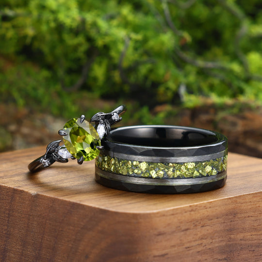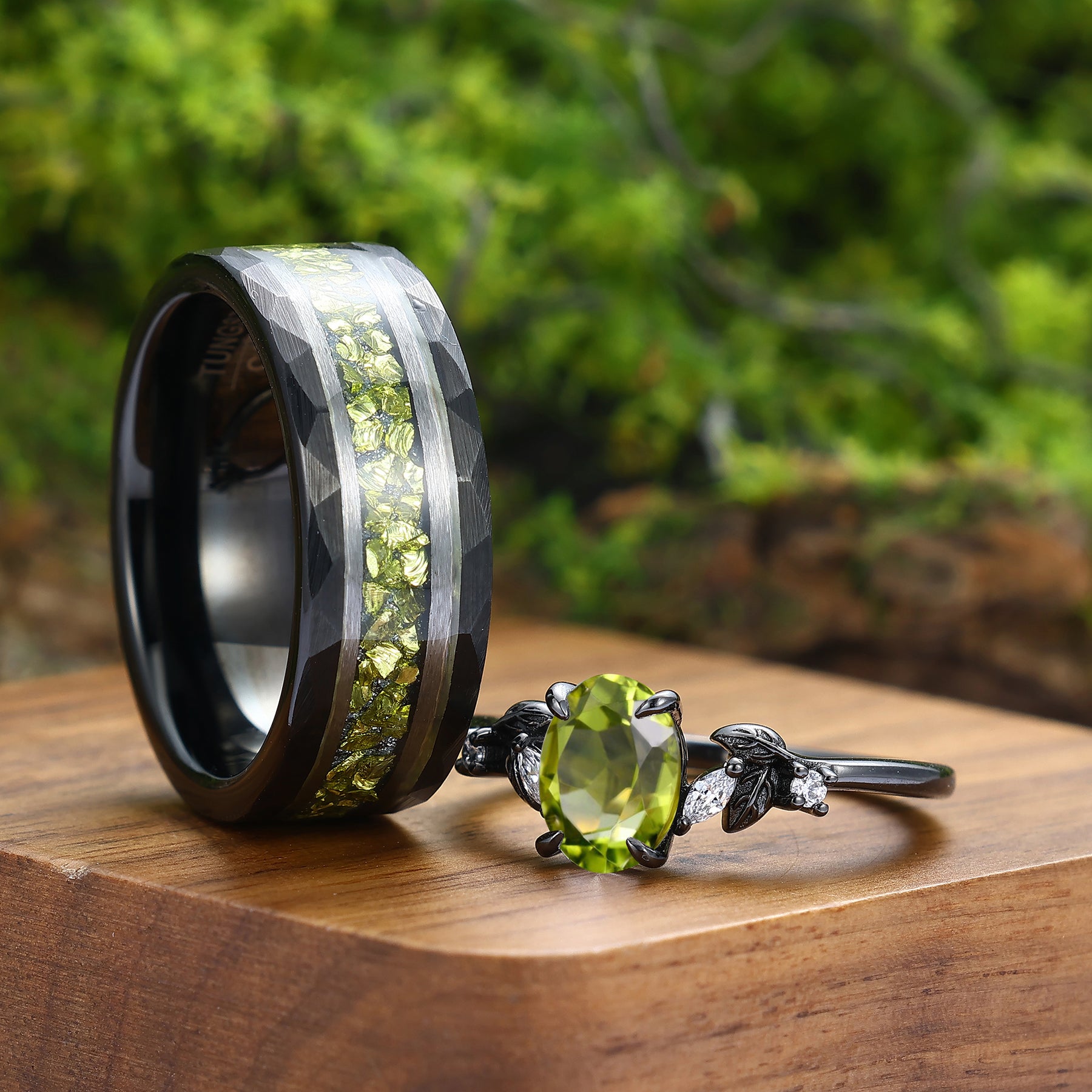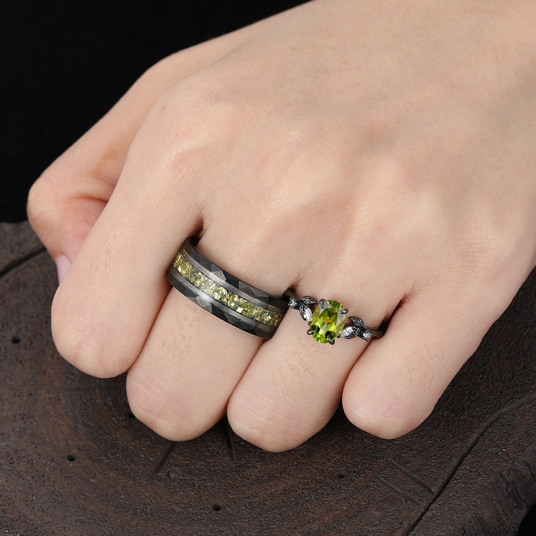 Branch Leaf Oval Peridot Couples Ring Set Green Peridot Ring For Men For Women