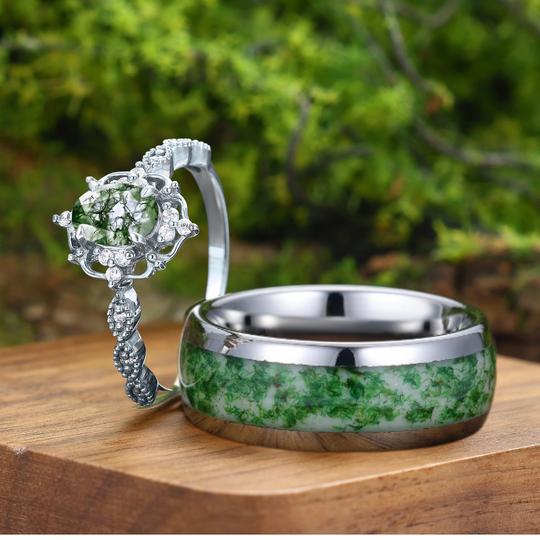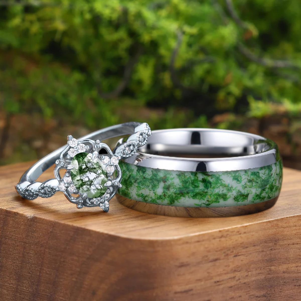 Brilliant Milgrained Green Moss Agate Couple Ring Green And White Matching Ring Set
