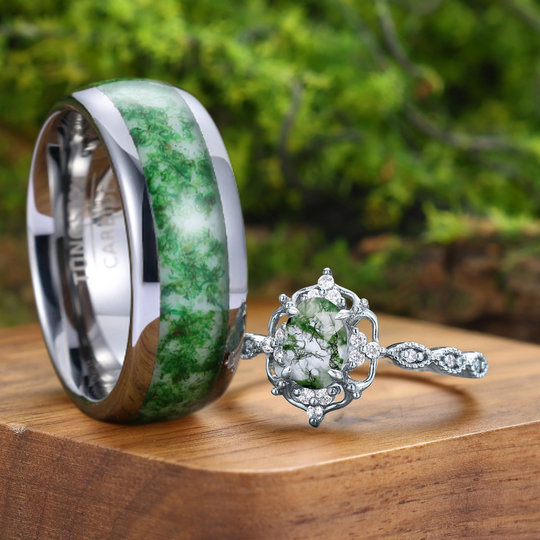 Metal Type: Tungsten Carbide - Crushed Moss Agate Inlay - Hypoallergenic