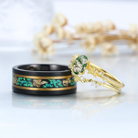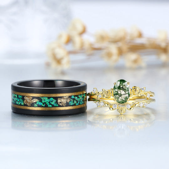 Dainty Green Emerald Rose Shape Yellow Gold Plated Couple Ring Set Matching Rings For Him For Her