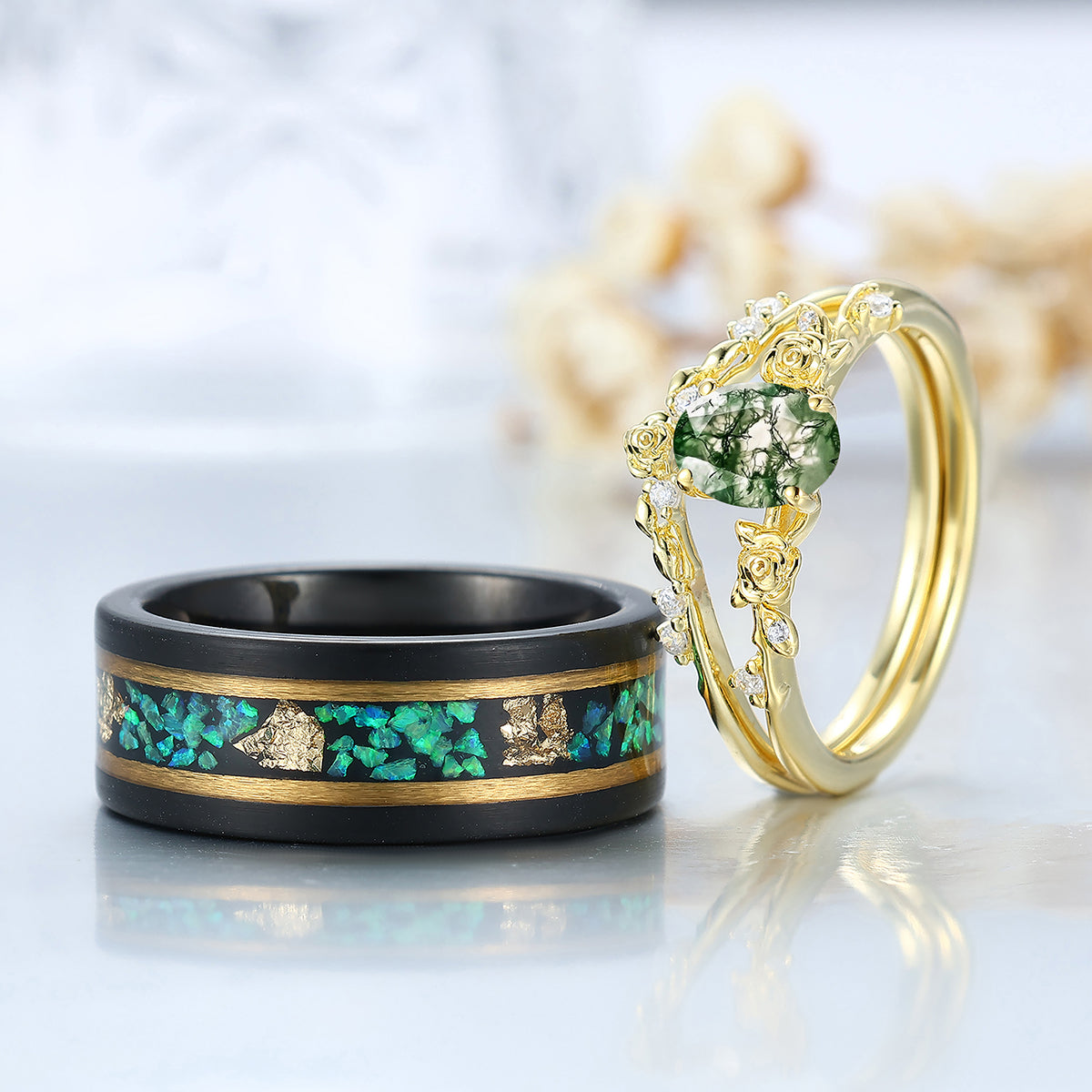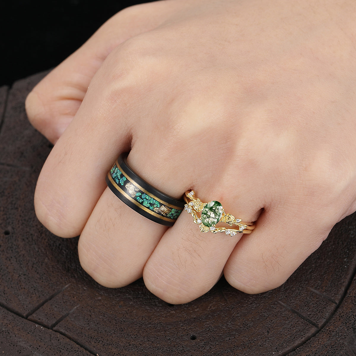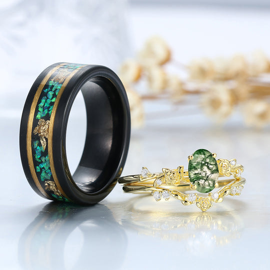Metal Type: Tungsten Carbide - Crushed Lab Blue Green Opal and Gold Foils Inlay - Hypoallergenic